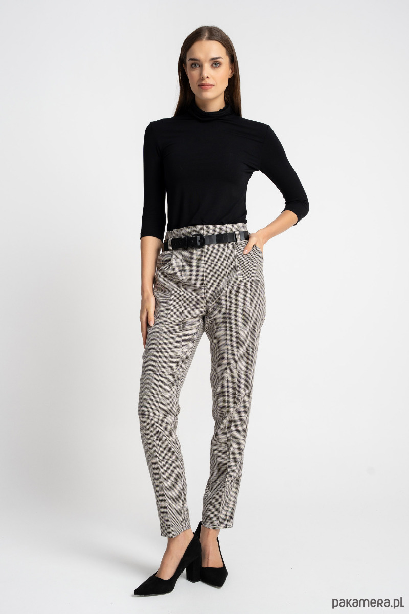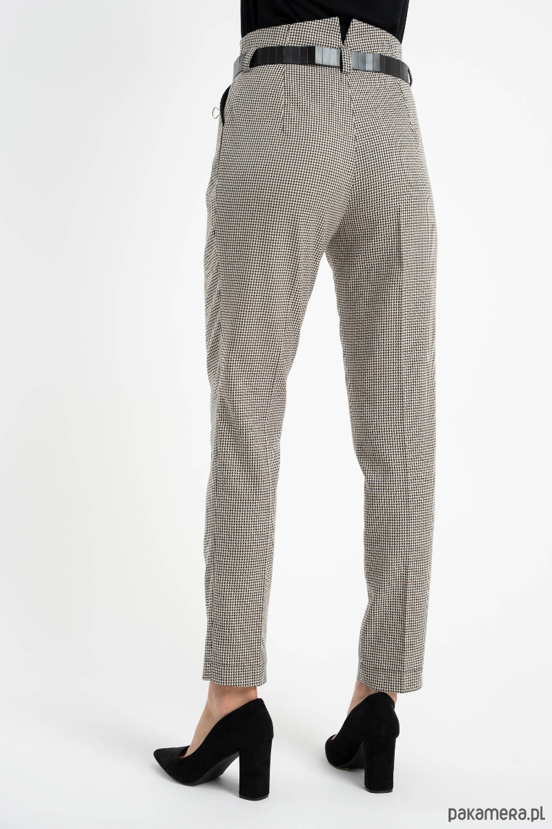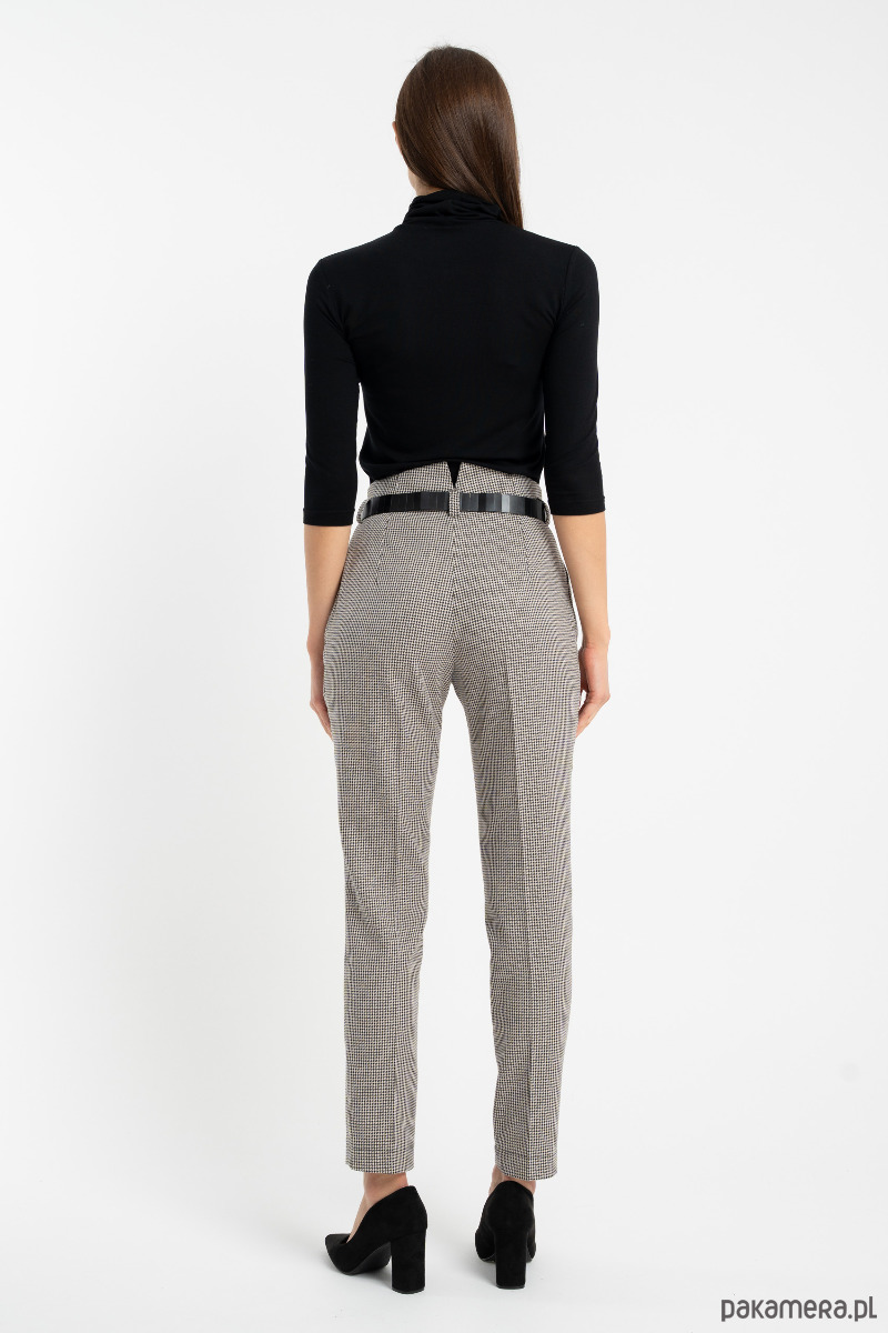 Eleganckie spodnie damskie o klasycznym kroju w delikatną, czarno-białą kratkę typu pepitka.