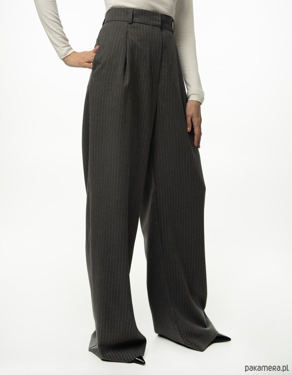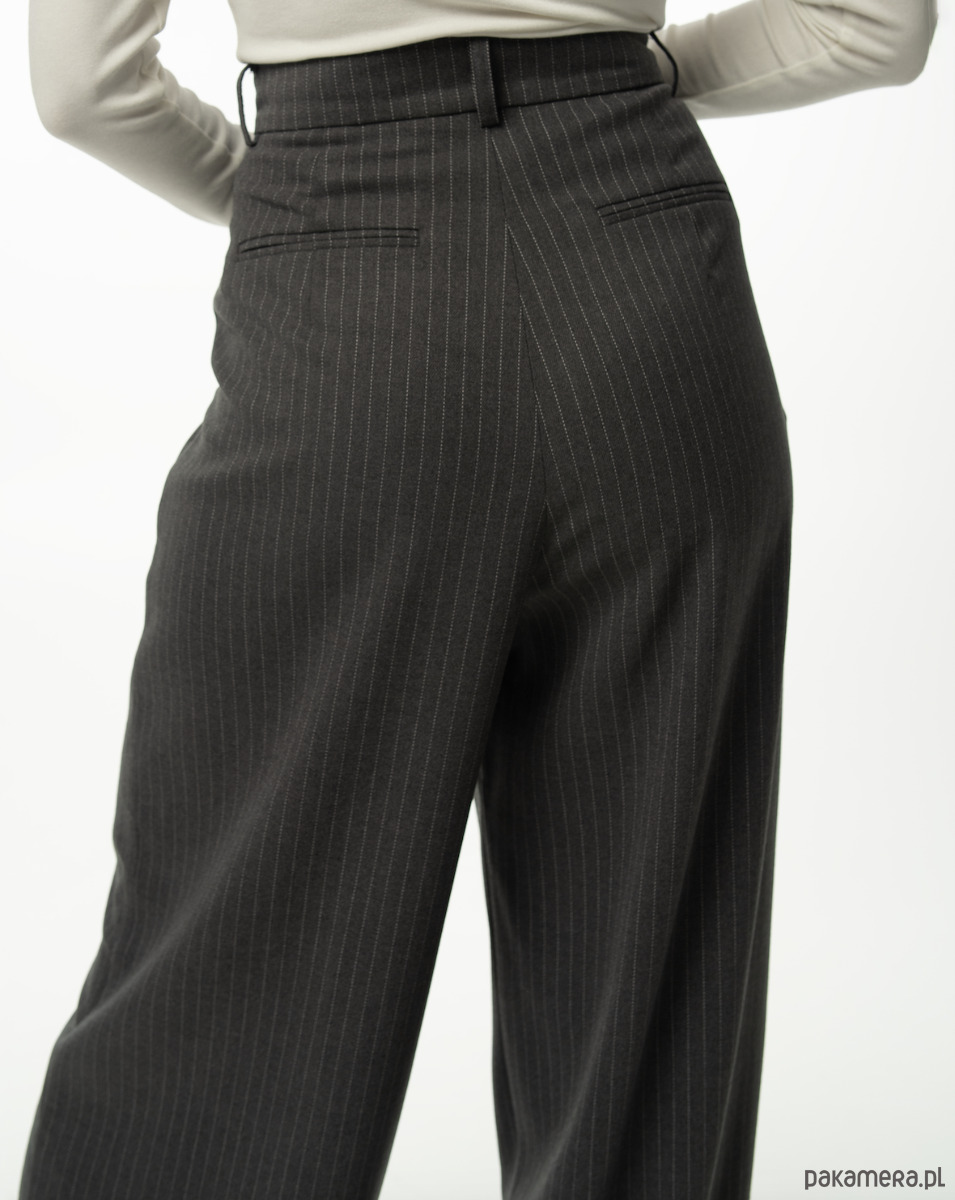 Materiał miękko układa się na ciele i zapewnia swobodę ruchów przez cały dzień. Ponadto cienkie pionowe paski wysmuklają sylwetkę i dodają całości eleganckiego charakteru. Spodnie doskonale sprawdzą się w pracy, podczas spotkań biznesowych oraz na co dzień. W rezultacie możesz z łatwością dopasować je do różnych stylizacji.