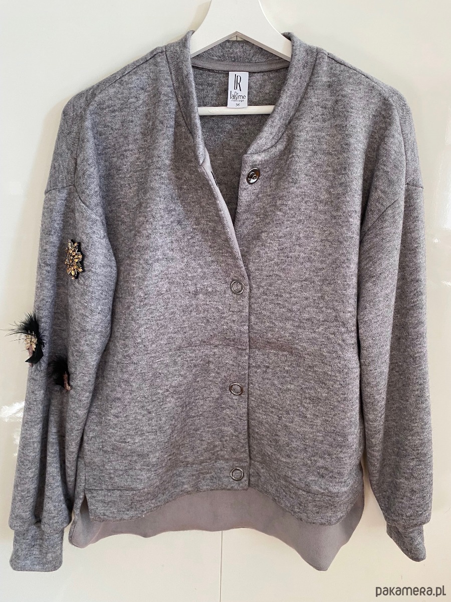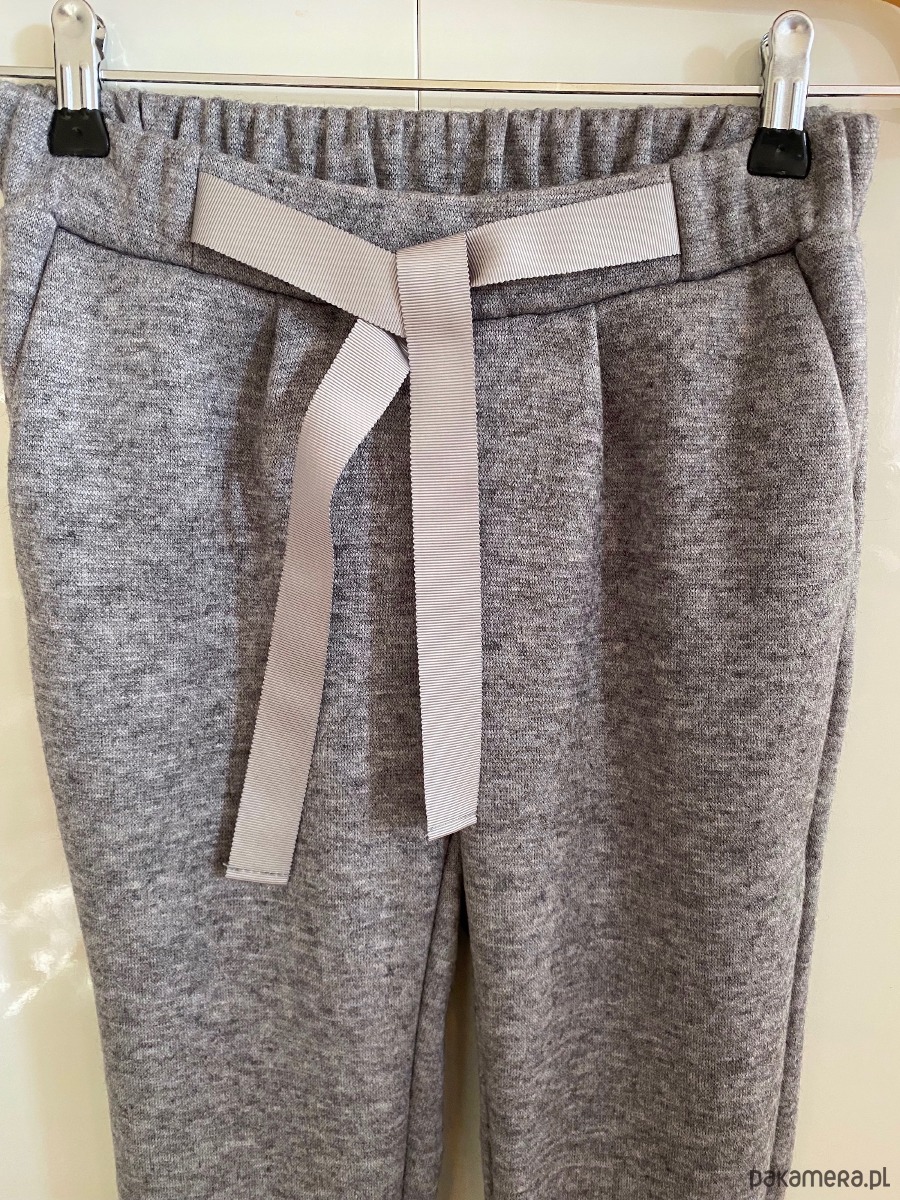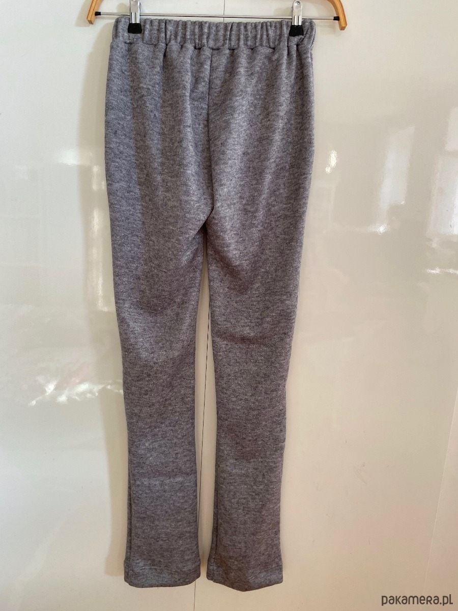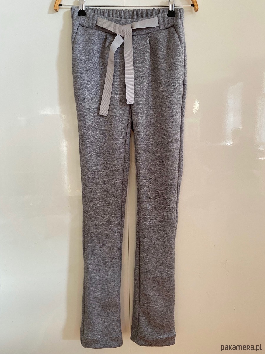 Spodnie Cykoria ze sweterkowej, wełnianej dzianiny. Forma spodni jest prosta nogawka. W pasie jest miękka guma, z marszczeniem na tyle i gładkim przodem. Na bokach są kieszenie. Na przodzie ozdobna taśma. Do kompletu można dobrać bomberkę, z tej samej dzianiny sweterkowej tak jak na zdjęciu, wstępna w sklepie.