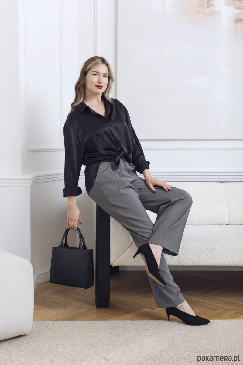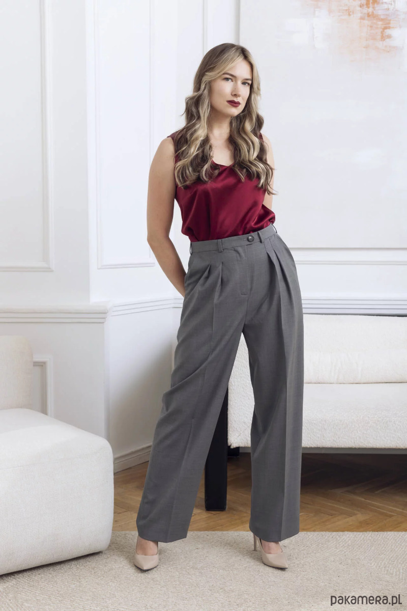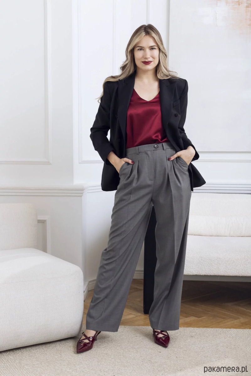 Linia Jazzy to nonszalanckie, szerokie spodnie z wysokim stanem. Inspirowane męską modą: z zakładkami, przedłużonym paskiem, wyższą talią i nogawką z kantem. Elegancja w jazzowym wydaniu. Szare wełniane spodnie są rozwiązaniem na cały rok: zestawisz je ze swetrem, topem, czy ulubioną jedwabną koszulą.