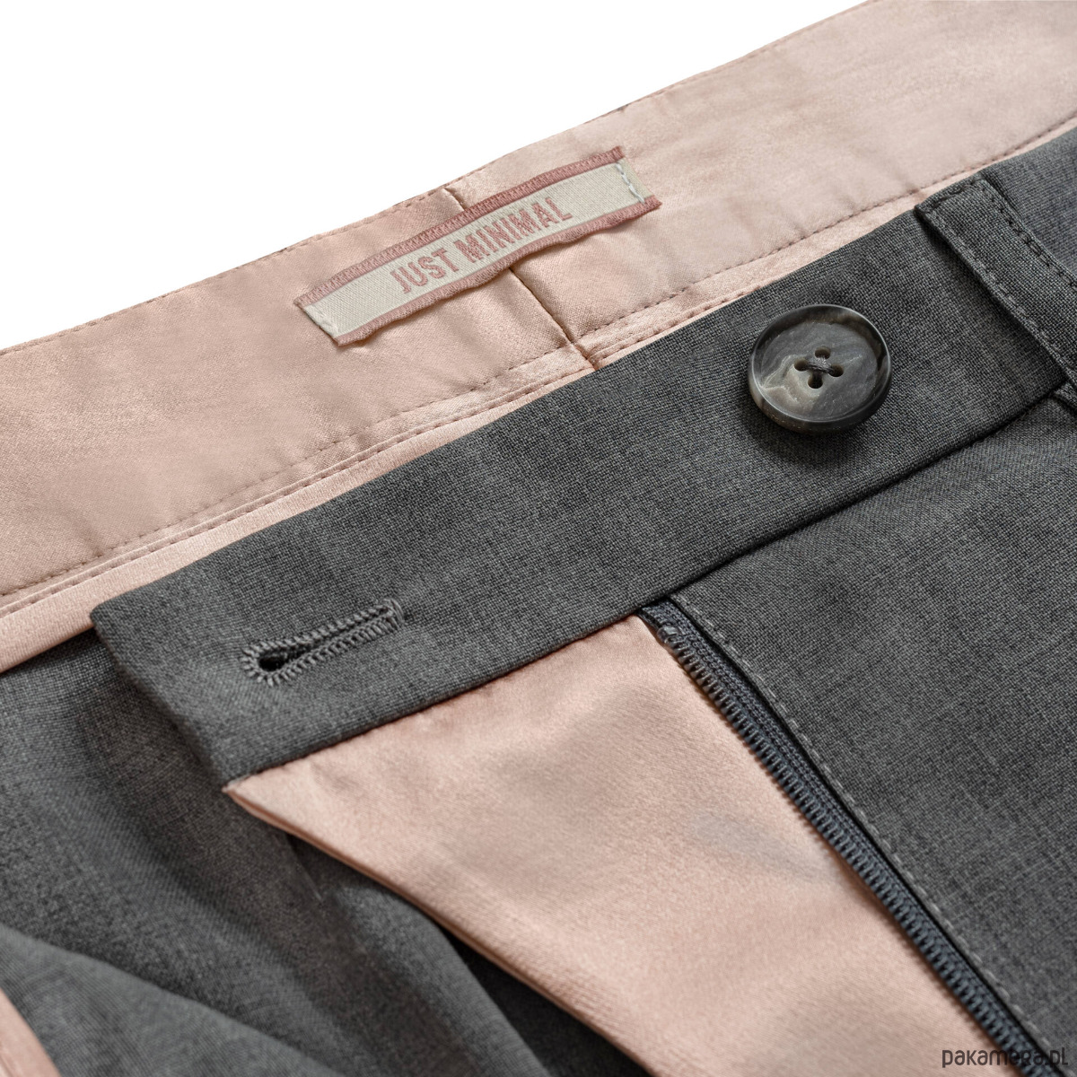 Rogowy lub oblekany guzik. Patka suwaka z lekkim łukiem – idealnie zasłania górę suwaka.