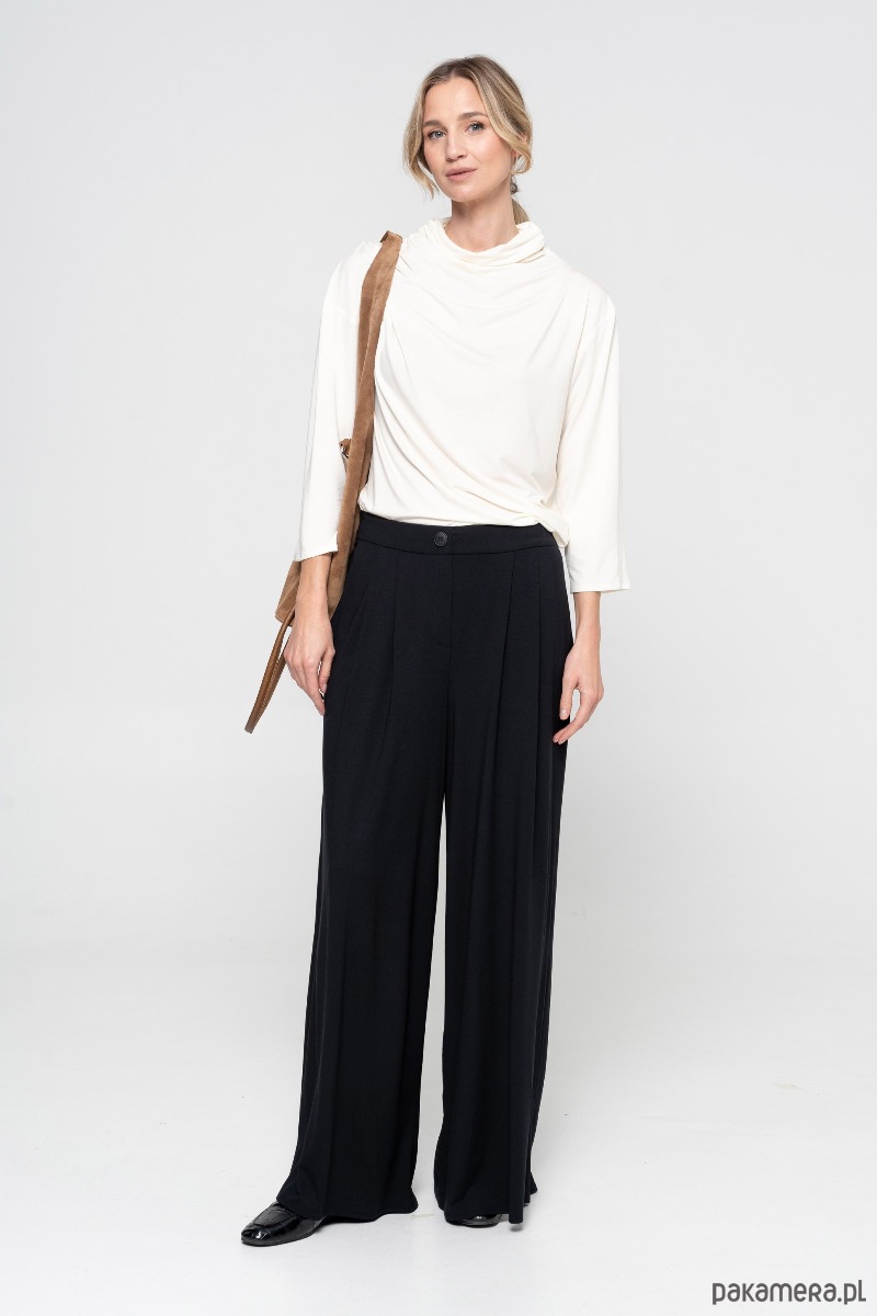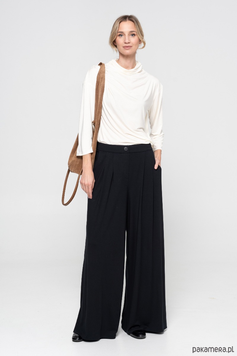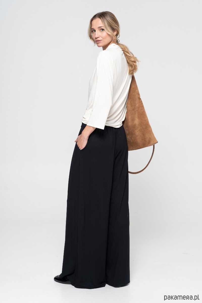 Szerokie spodnie z kieszeniami. Guma w pasie zapewnia duży komfort noszenia. Nogawka bardzo szeroka, przez co spodnie się nie opinają i są bardzo wygodne. Fason bardzo uniwersalny dobrze leży na różnych typach sylwetki.