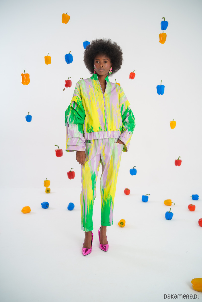 Wzór: Żywy, malarski wzór w odcieniach zieleni, żółci i fioletu, który przyciąga wzrok i dodaje charakteru każdej stylizacji.