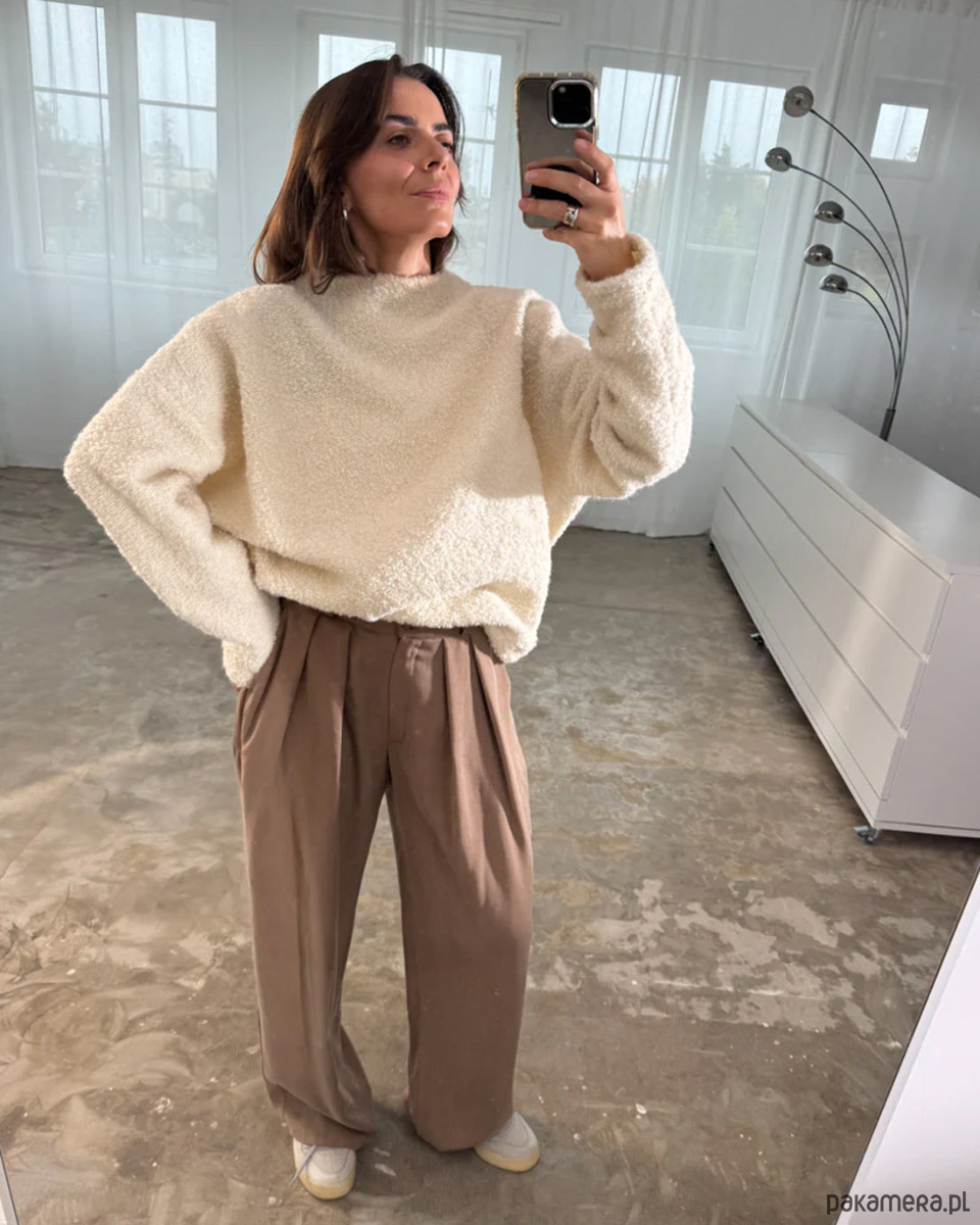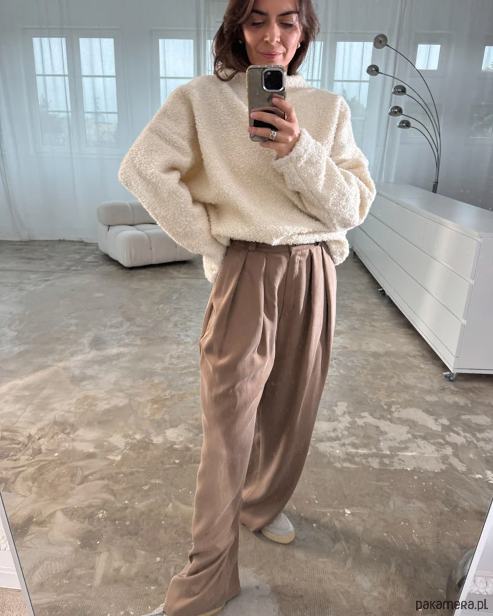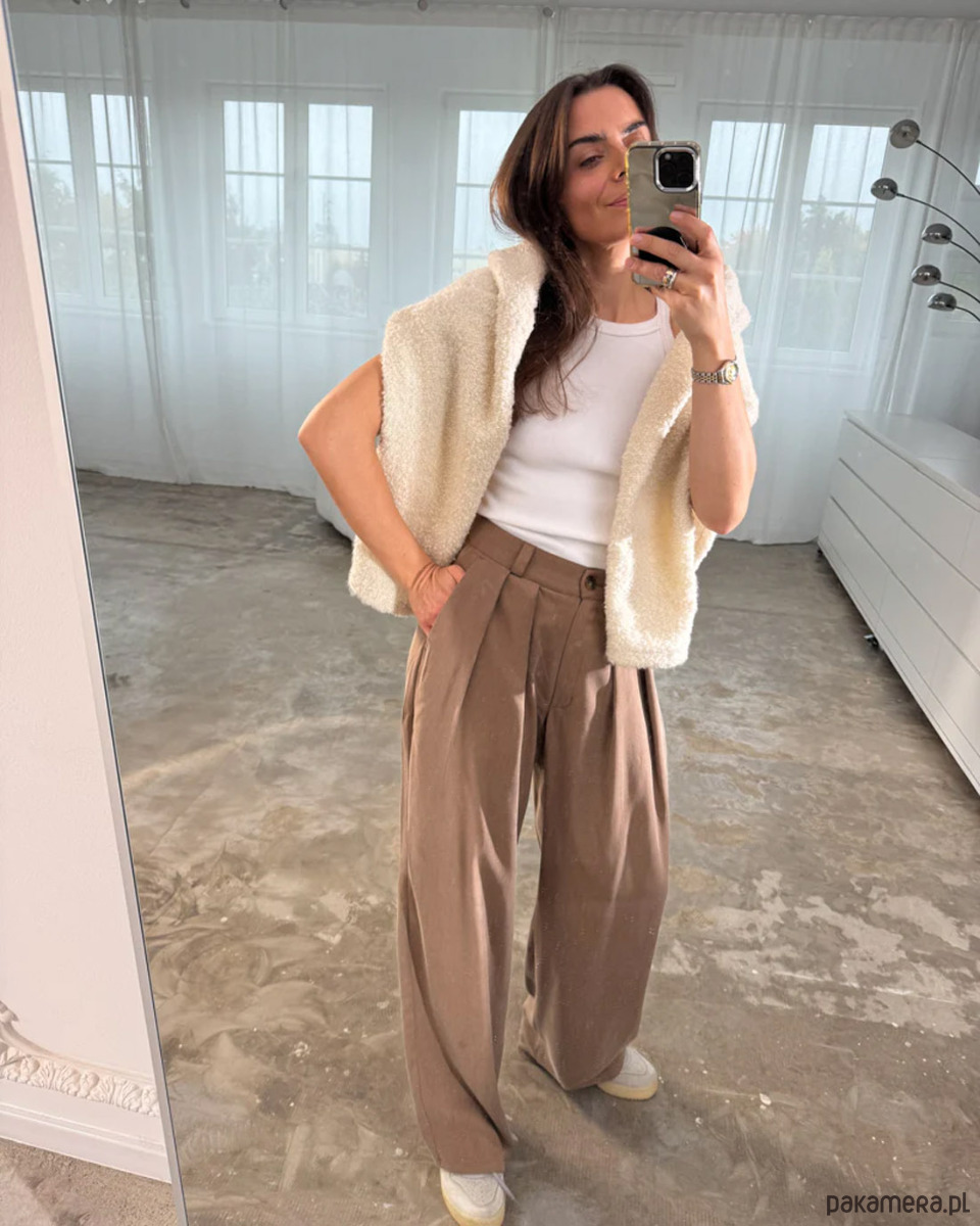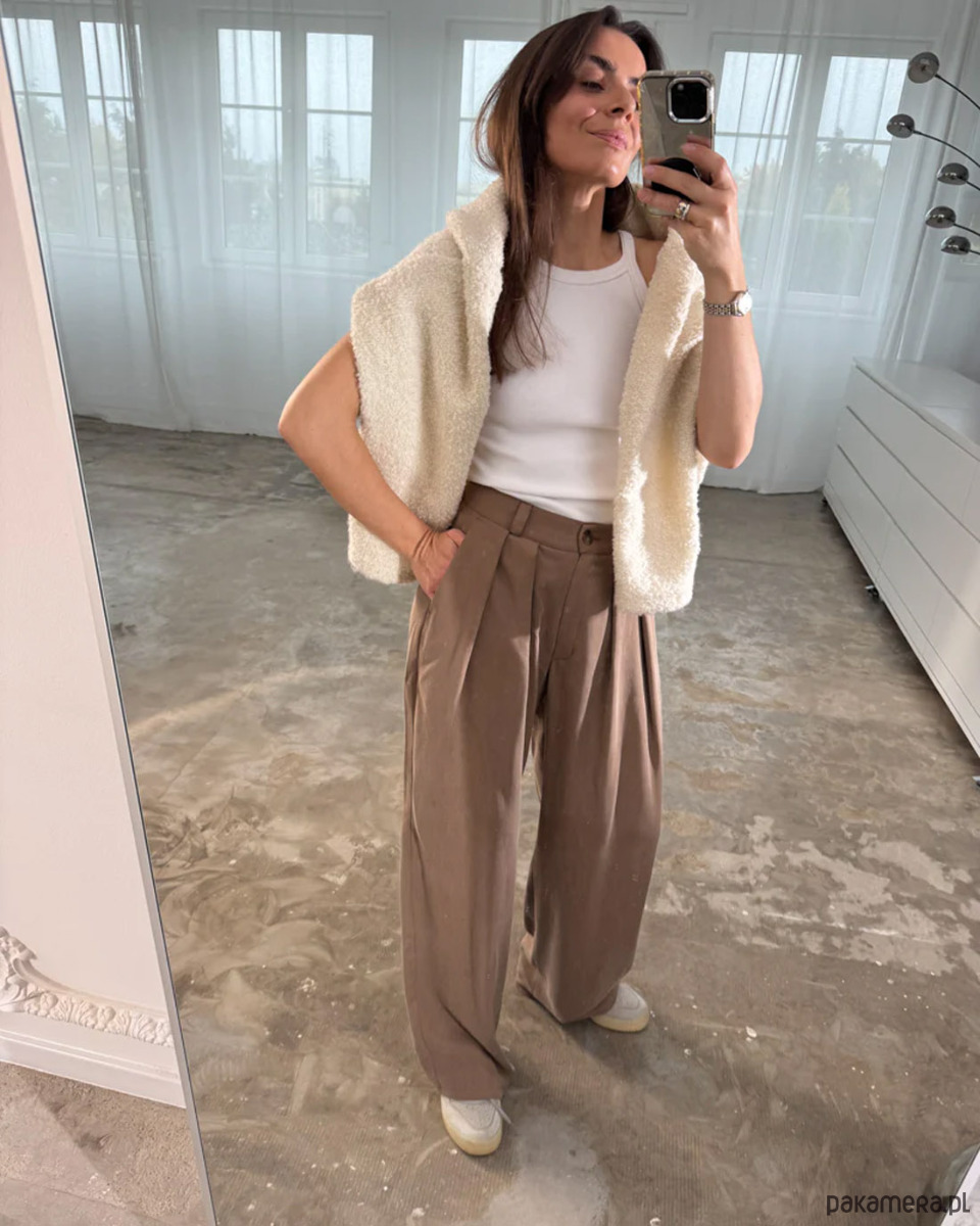 Spodnie Wonder w kolorze Brown to nowoczesny klasyk łączący ponadczasową elegancję z komfortem. Uszyte w Polsce ze 100% tencelu premium – tkaniny oddychającej, miękkiej i przyjaznej środowisku – są idealnym wyborem dla kobiet ceniących jakość i świadome podejście do mody. Perfekcyjnie skrojony fason z wysokim stanem, zakładkami w talii i szeroką nogawką optycznie wysmukla sylwetkę, nadając jej lekkości i proporcji. Głęboki odcień Brown (czekoladowy brąz) świetnie wpisuje się w minimalistyczne stylizacje kapsułowej garderoby – od biurowej elegancji po casual z nutą nonszalancji.
