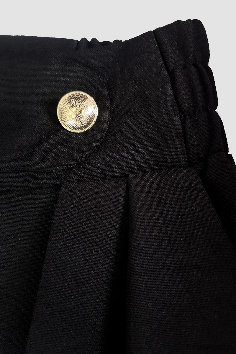 Eleganckie spodnie z lekkiej tkaniny, z paskiem częściowo na gumie i ozdobnymi złotymi guzikami na przodzie to niezawodny element kapsułowej garderoby.