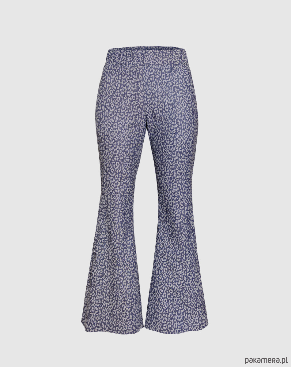 Elastyczne jeansowe spodnie we wzór panterki, typu dzwony. Bardzo wygodne ponieważ uszyte z elastycznej tkaniny jeansowej, dzięki czemu dopasowują się do ciała i nie krępują ruchów. Pas na gumie. Krój z nogawkami rozszerzającymi się do dołu. Na zdjęciu Ula (167 cm wzrostu) ma na sobie rozmiar L.