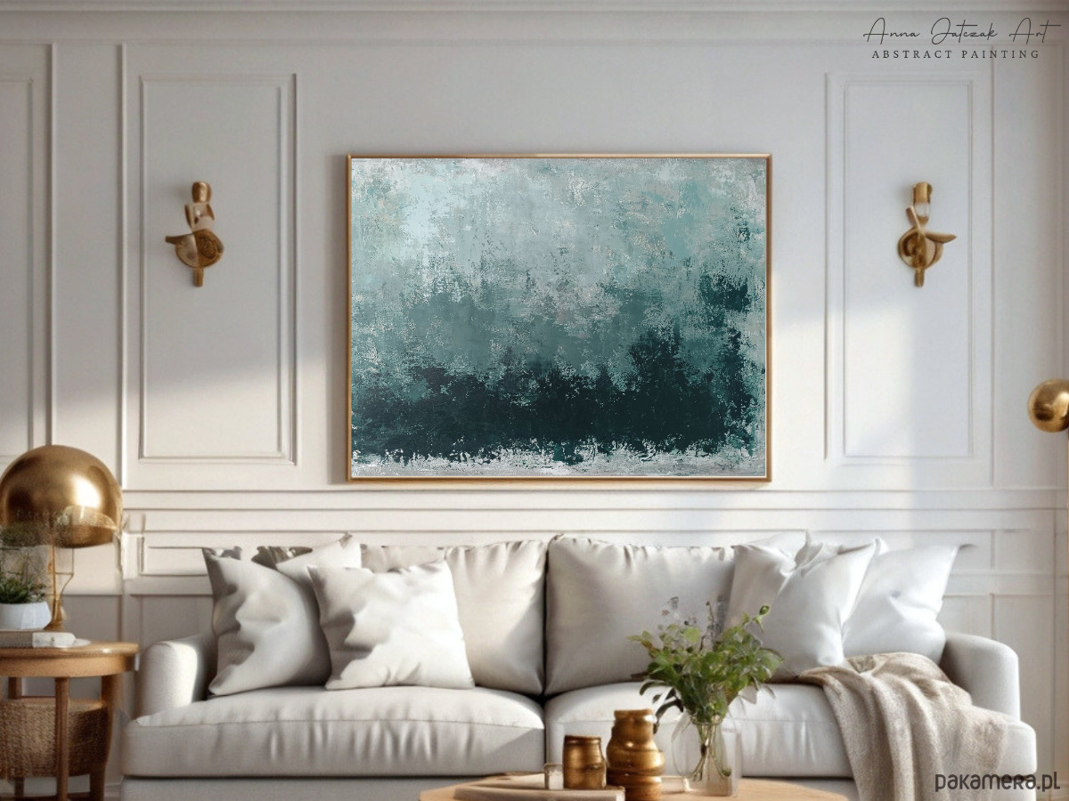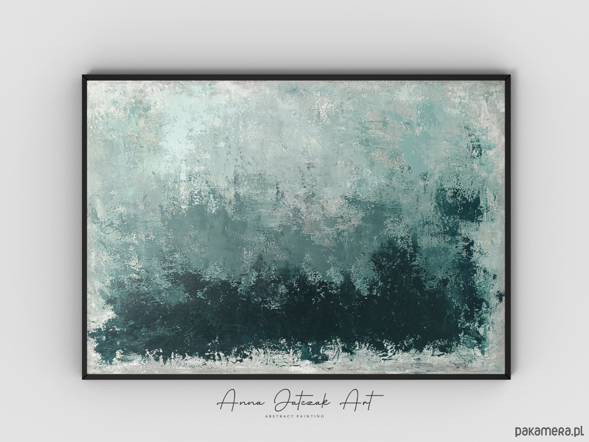 Oryginalny, ręcznie malowany obraz akrylowy. Zanurz się w ukojenie zieleni, szarości i subtelnego beżu.