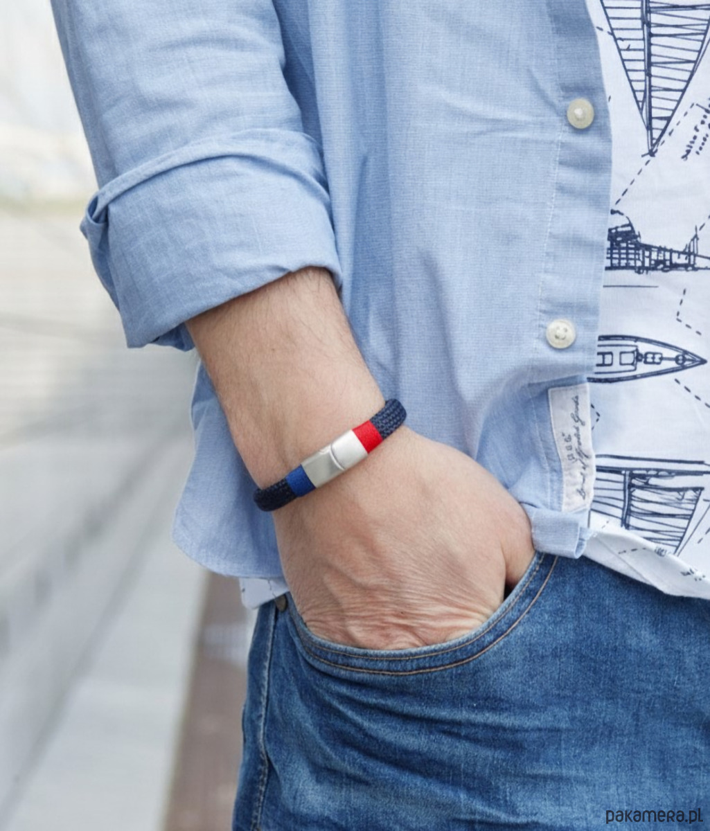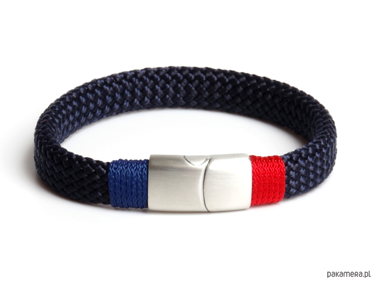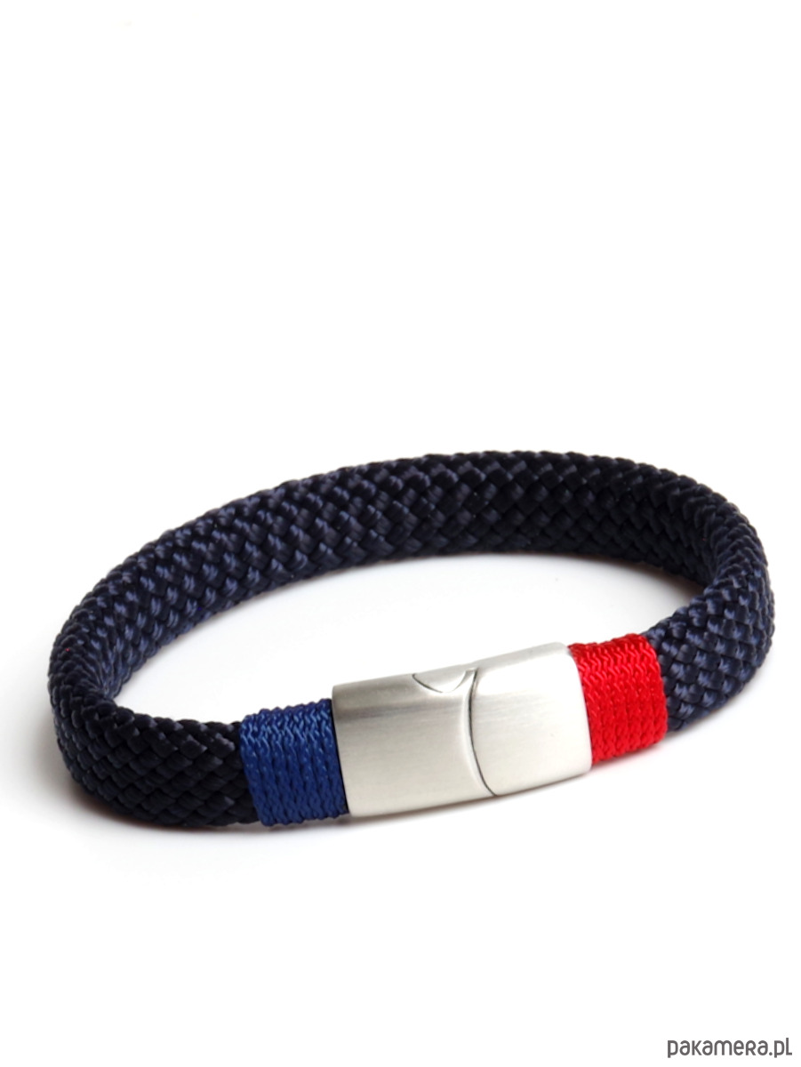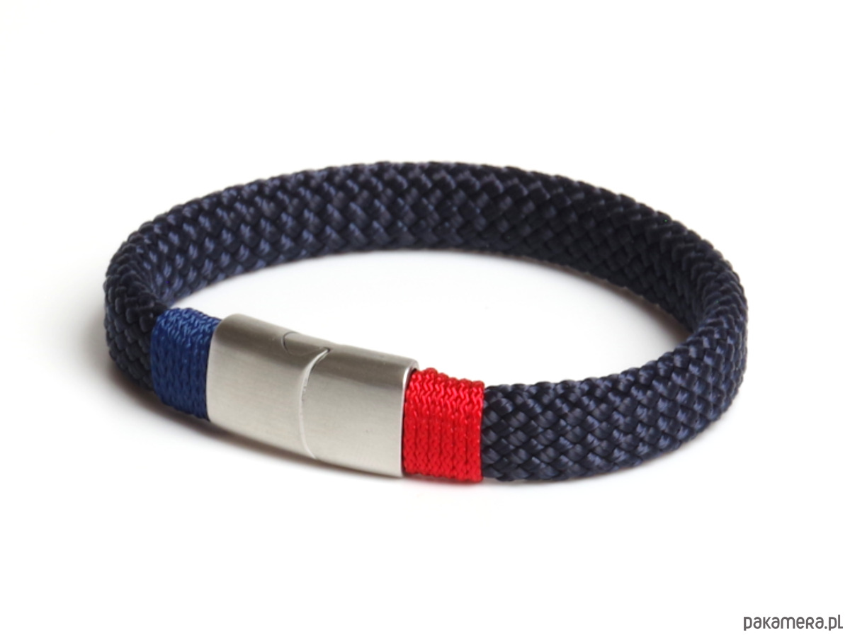 Modna bransoleta męska wykonana z usztywnionej liny żeglarskiej w kolorze granatowym z wstawkami grantowe i czerwone. Dodaje charakteru marynistycznego.