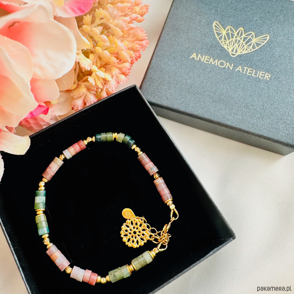 SPRING- Bransoletka z kamieni , różowa bransoletka z agatów, rozetka