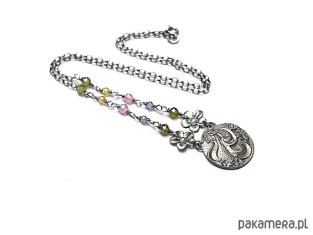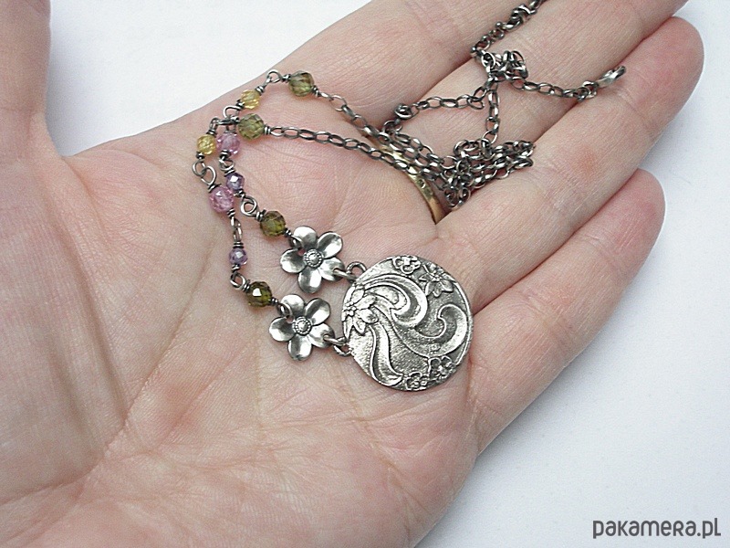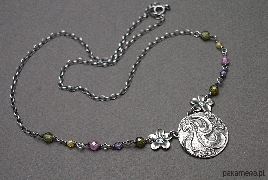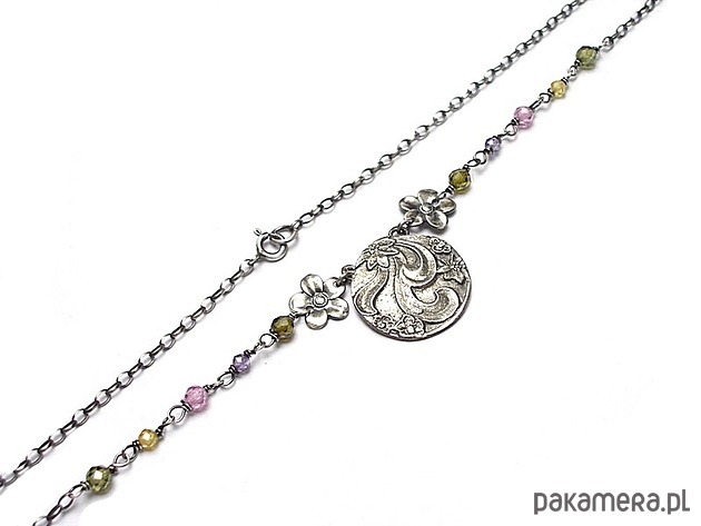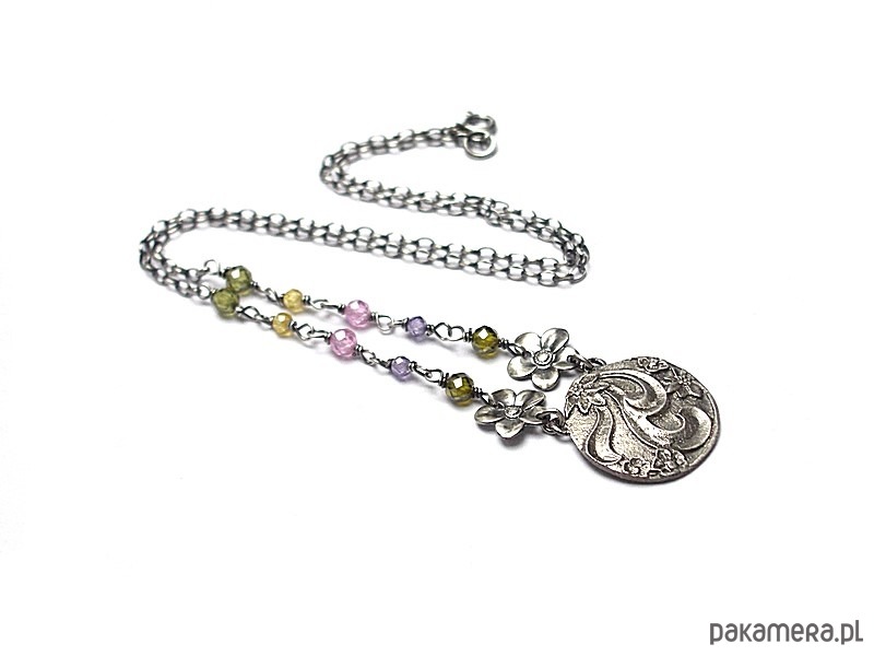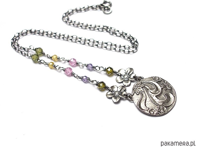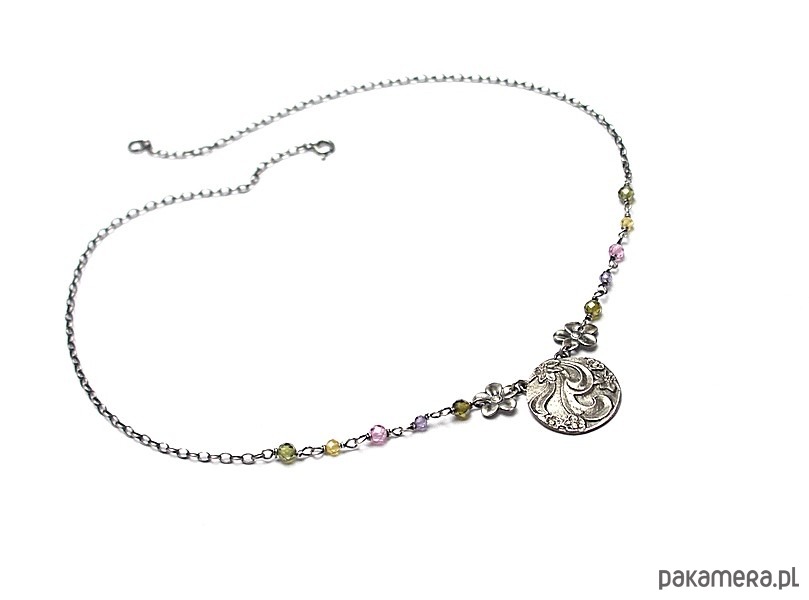Naszyjnik wykonany od podsta ze srebra [pr. 925] w połączeniu kuleczkami cyrkonii [3mm i 4mm], srebrnymi kwiatuszkami oraz własnoręcznie wykonaną zawieszką. Srebro oksydowane i przetarte. Całkowita długość naszyjnika 47cm. Biżuteria ozdobnie zapakowana