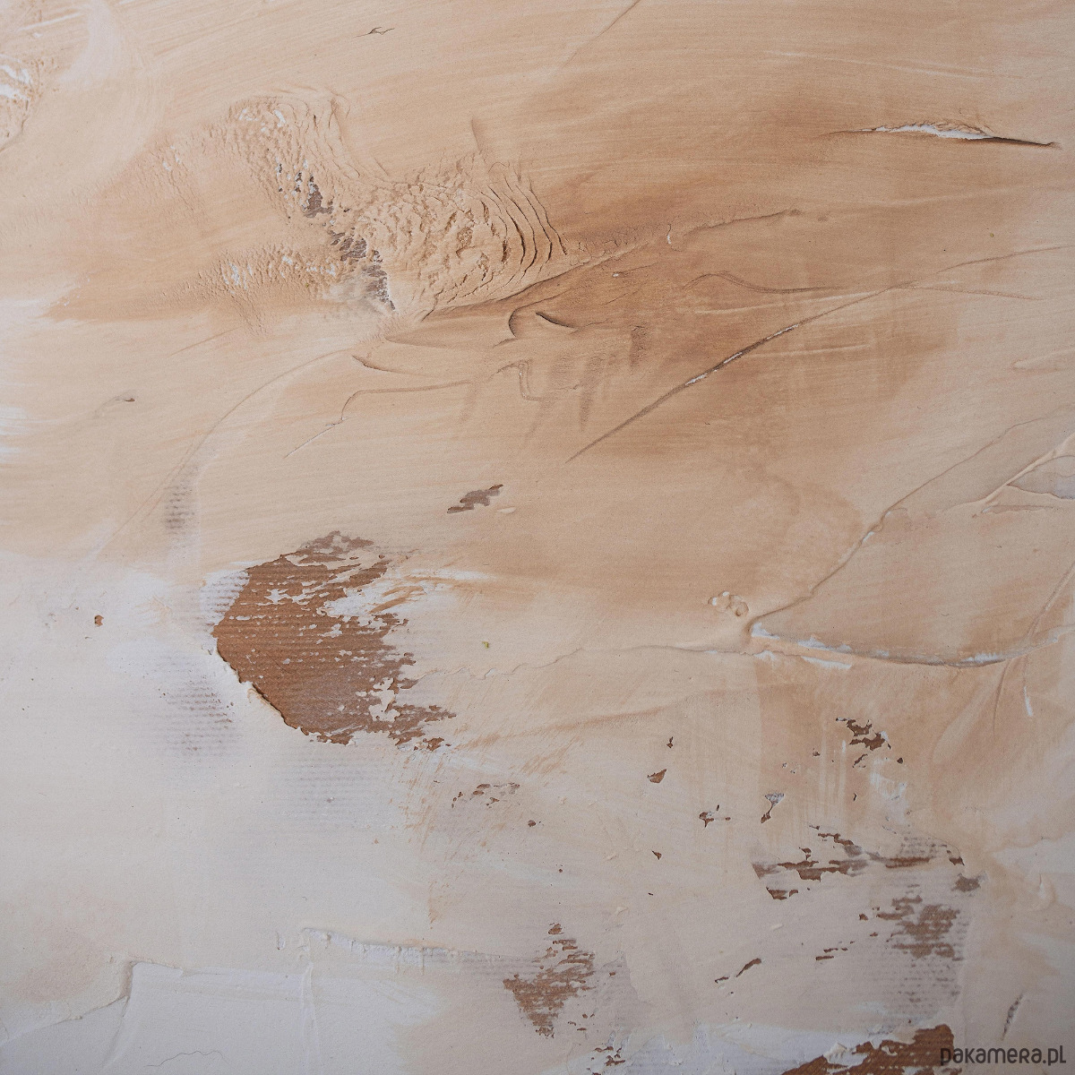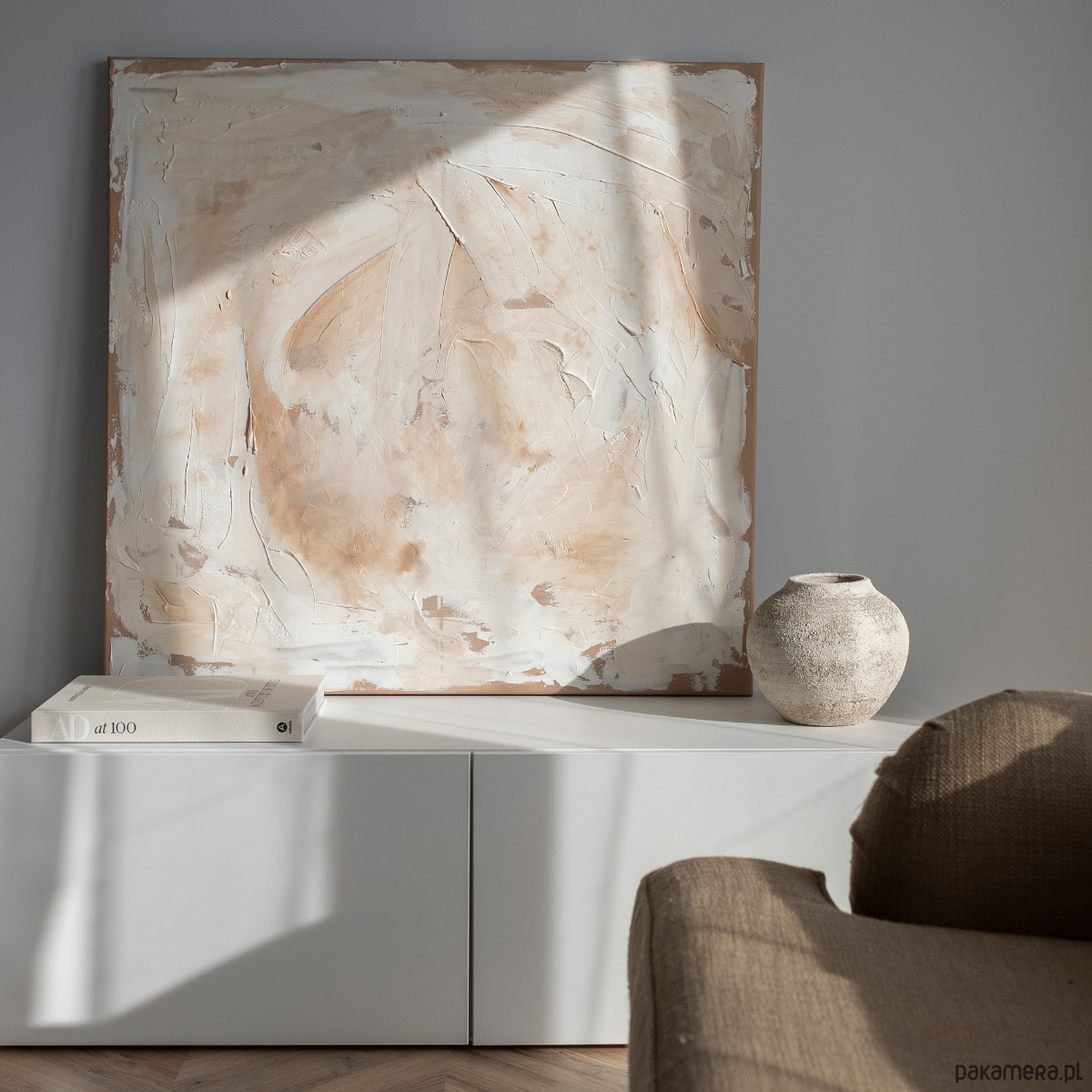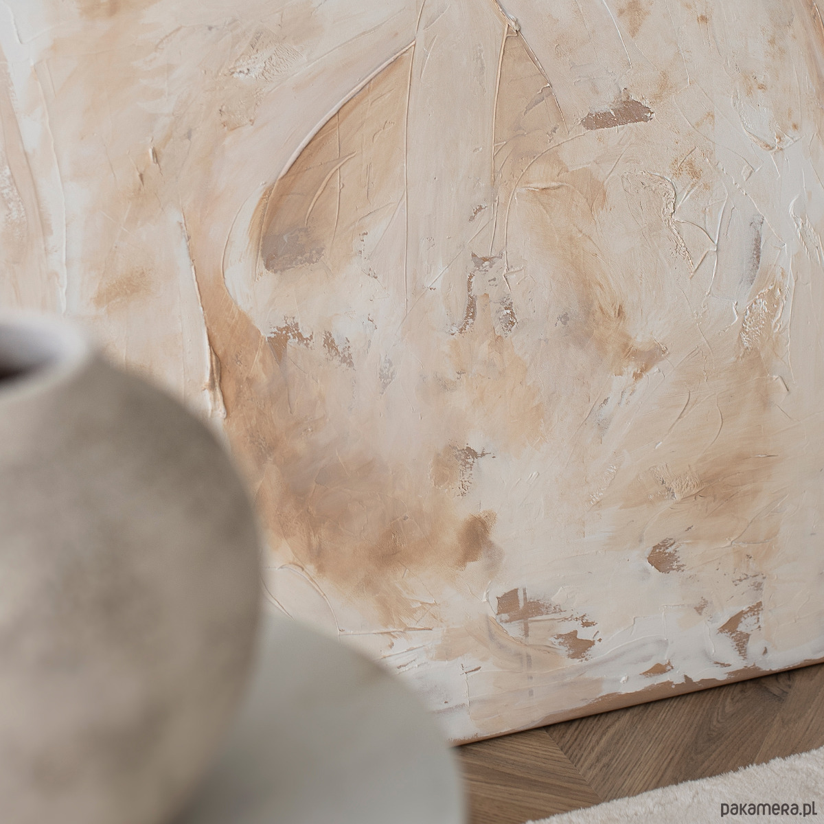 Ten oryginalny obraz strukturalny charakteryzuje się warstwowymi teksturami gipsu, subtelnymi pociągnięciami pędzla oraz ciepłą paletą beżów, piasków, kremów i stonowanych odcieni ziemi.