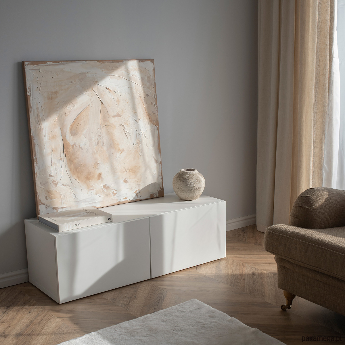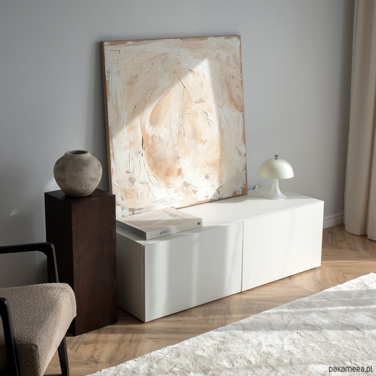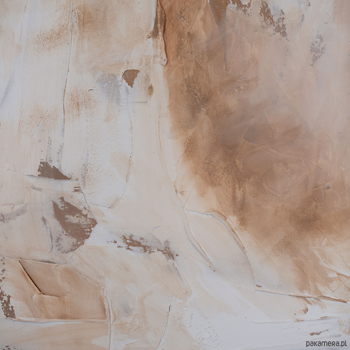 Ten oryginalny obraz strukturalny charakteryzuje się warstwowymi teksturami gipsu, subtelnymi pociągnięciami pędzla oraz ciepłą paletą beżów, piasków, kremów i stonowanych odcieni ziemi.