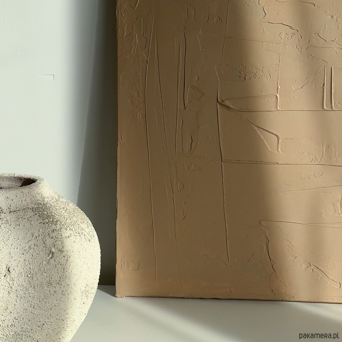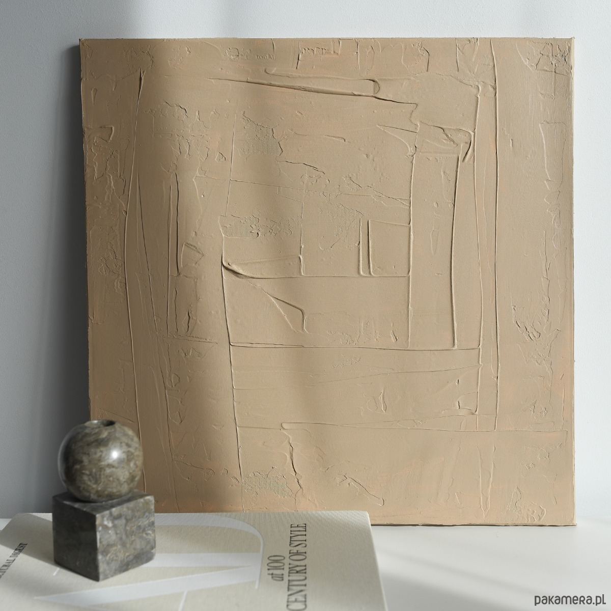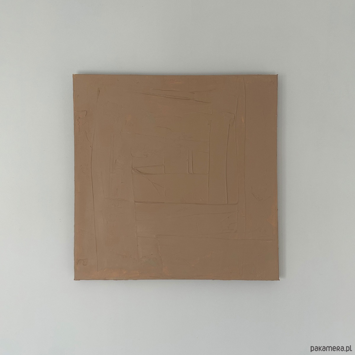 Ręcznie wykonany obraz strukturalny w ciepłym, beżowym odcieniu. Minimalistyczna abstrakcja z delikatną fakturą, która pięknie pracuje ze światłem i tworzy subtelne cienie na powierzchni.