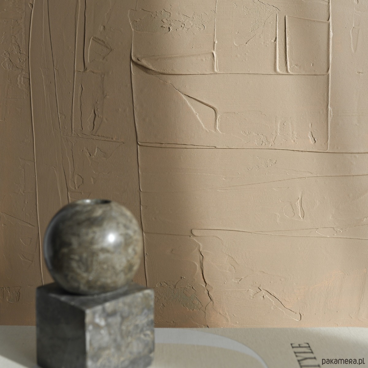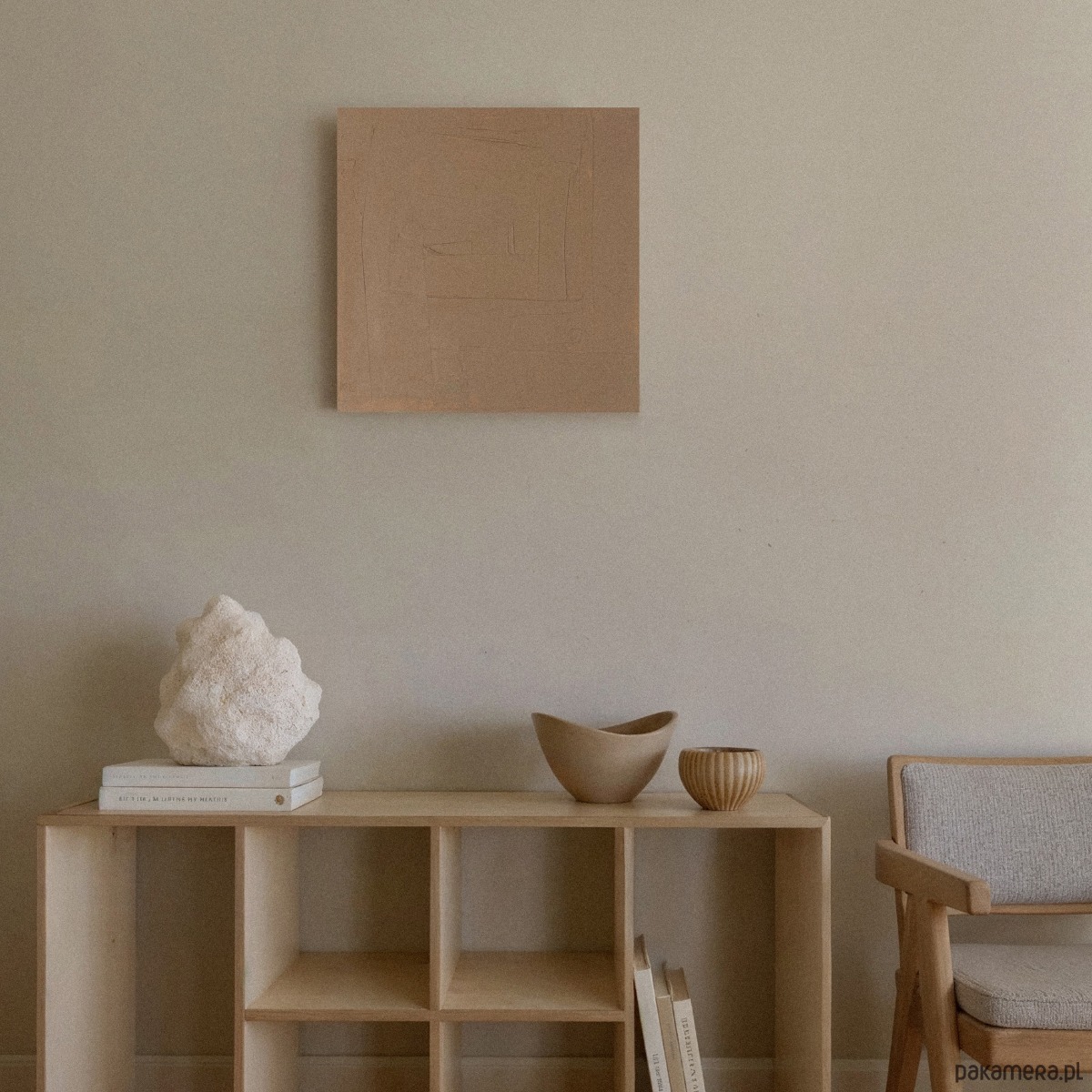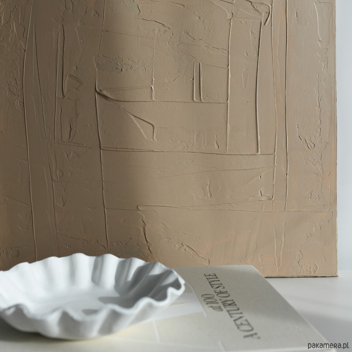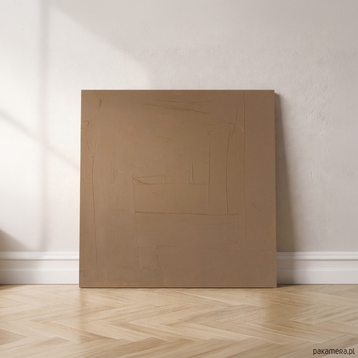 Ręcznie wykonany obraz strukturalny w ciepłym, beżowym odcieniu. Minimalistyczna abstrakcja z delikatną fakturą, która pięknie pracuje ze światłem i tworzy subtelne cienie na powierzchni.