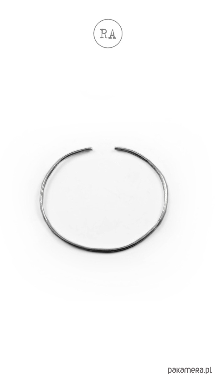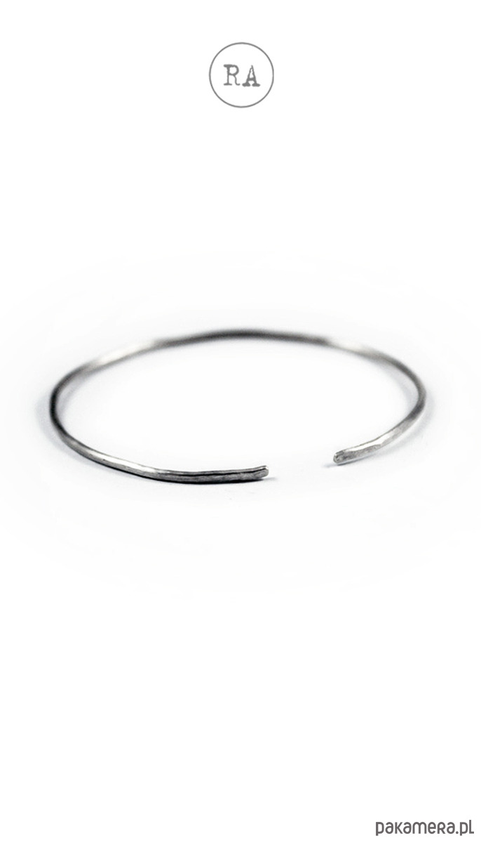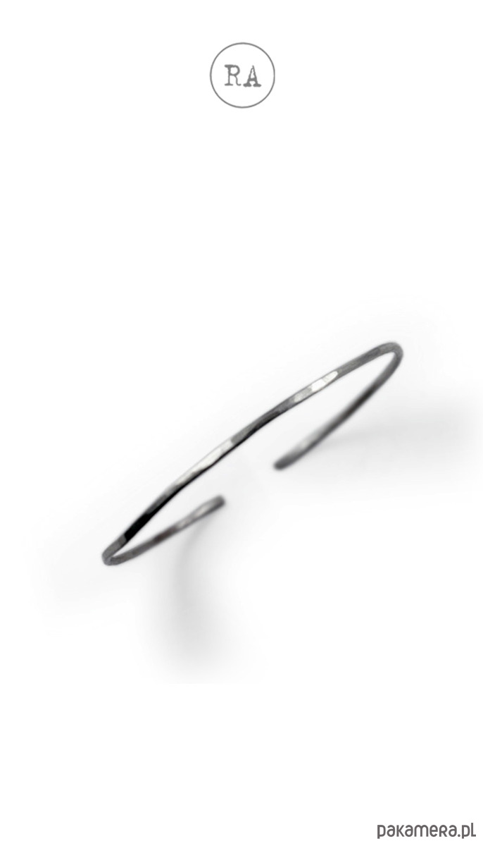 Srebrna bransoleta otwarta, o szerokości ok. 2 mm, młotkowana, lekko oksydowana.