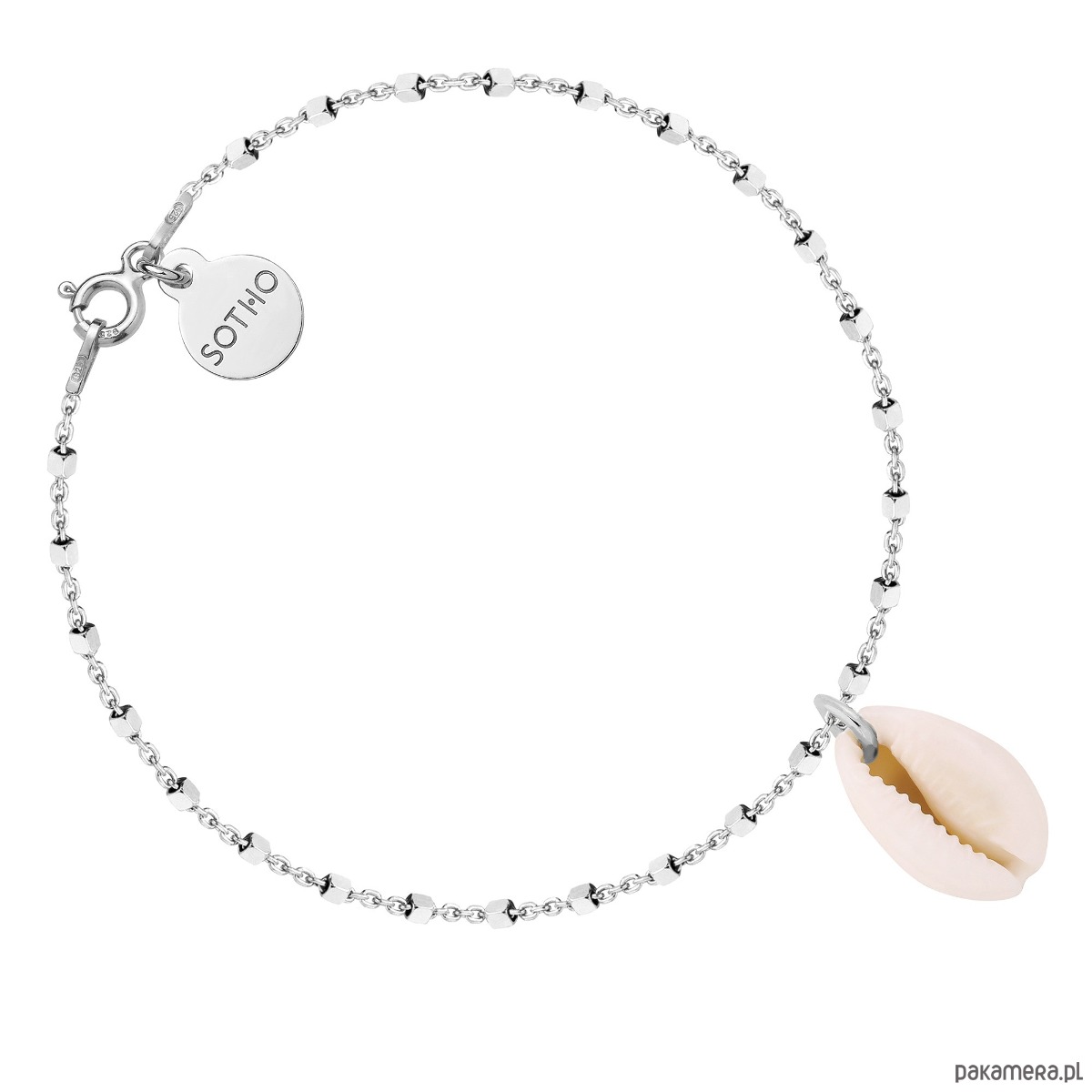 Srebrna bransoletka kosteczkowa zdobiona muszelką oraz zawieszką z logo marki. Wykonana ze srebra 925.