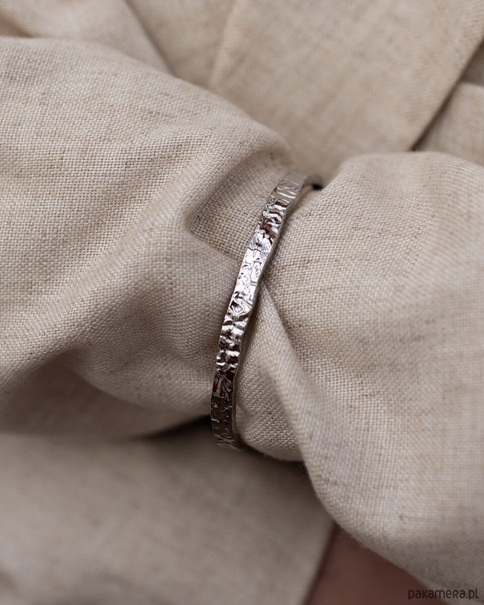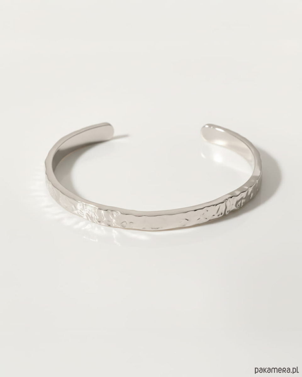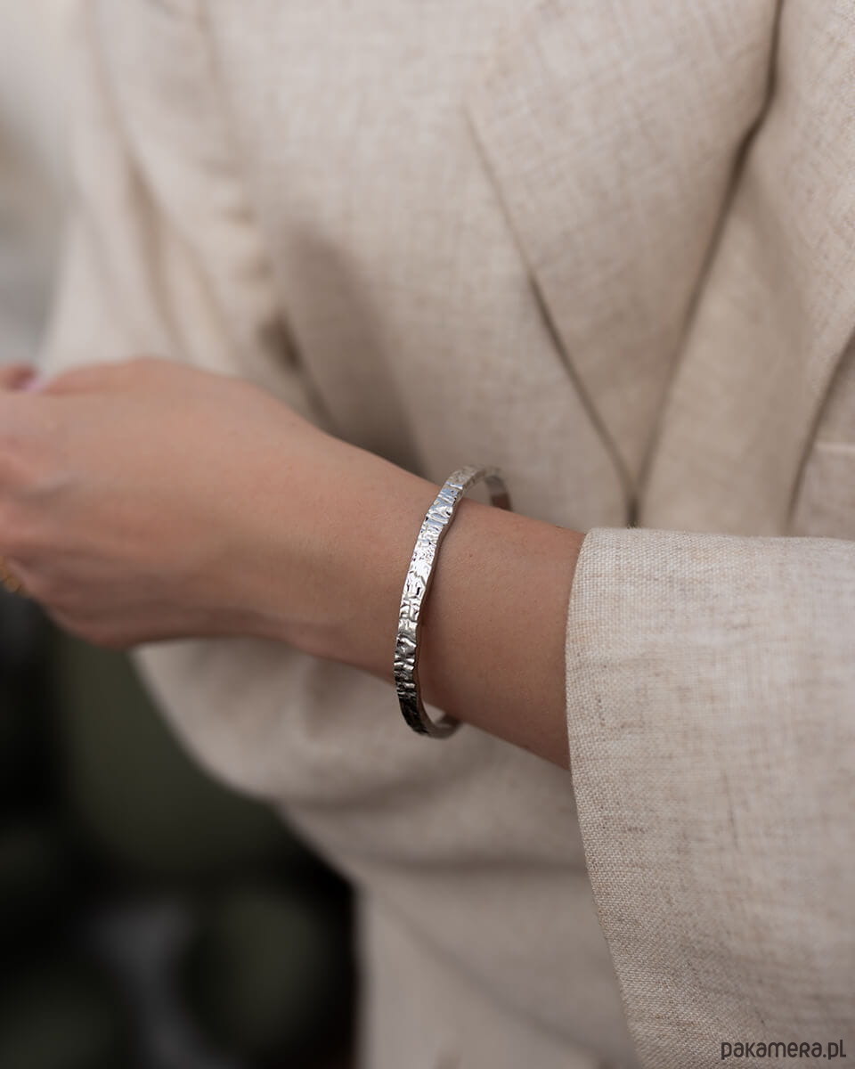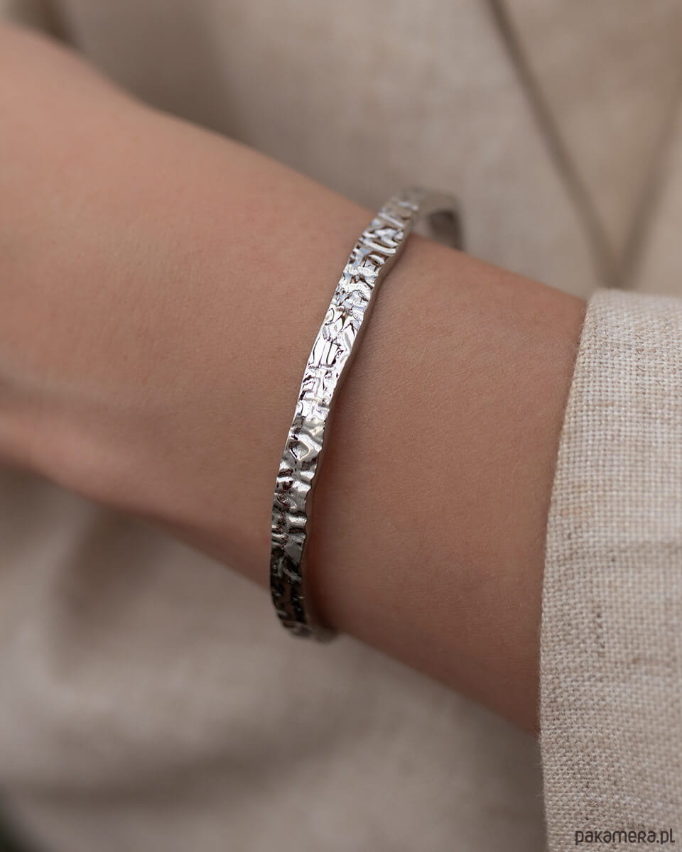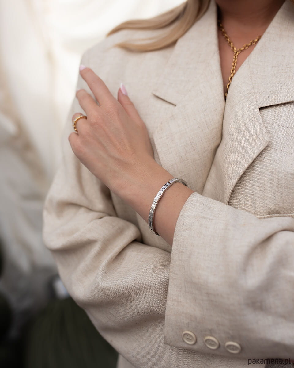 Szukasz biżuterii, która wygląda stylowo, a przy tym nie wymaga zdejmowania przed prysznicem, na siłowni czy podczas wakacji nad morzem? Ta elegancka bransoletka ze stali chirurgicznej premium została stworzona właśnie dla Ciebie!Jej minimalistyczny, surowy design z młotkowanym wykończeniem przyciąga wzrok i dodaje charakteru każdej stylizacji - od codziennych jeansów i t-shirtu, po elegancką sukienkę na wieczór. To biżuteria dla kobiet, które cenią prostotę, ale nie rezygnują z wyrafinowanego stylu.Stal chirurgiczna premium, z której wykonano bransoletkę, nie ciemnieje, nie rdzewieje i jest w 100% hipoalergiczna - idealna dla wrażliwej skóry. Możesz nosić ją non stop, bez obaw o ślady użytkowania czy uczulenia. Jej trwałość to inwestycja na lata!Wymiary:Rozmiar regulowany (średnica wewnętrzna bez rozciągania: 5,8 cm)Grubość: 0,5 cm