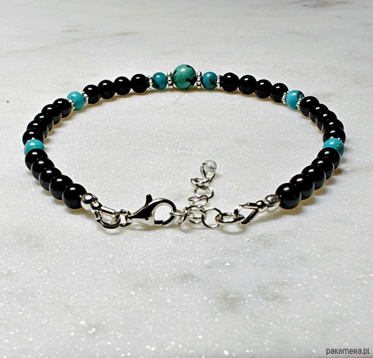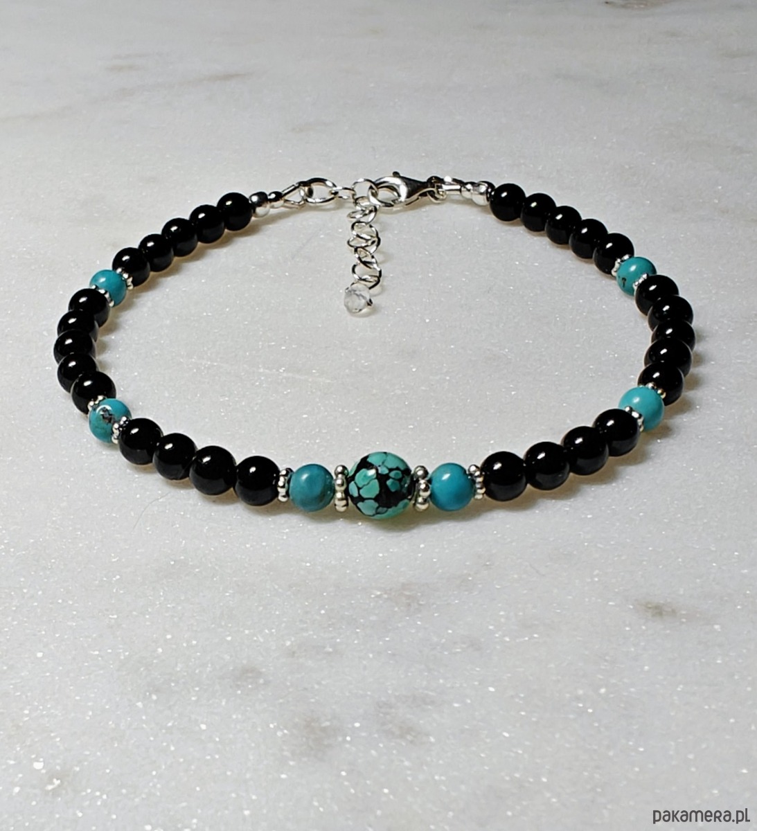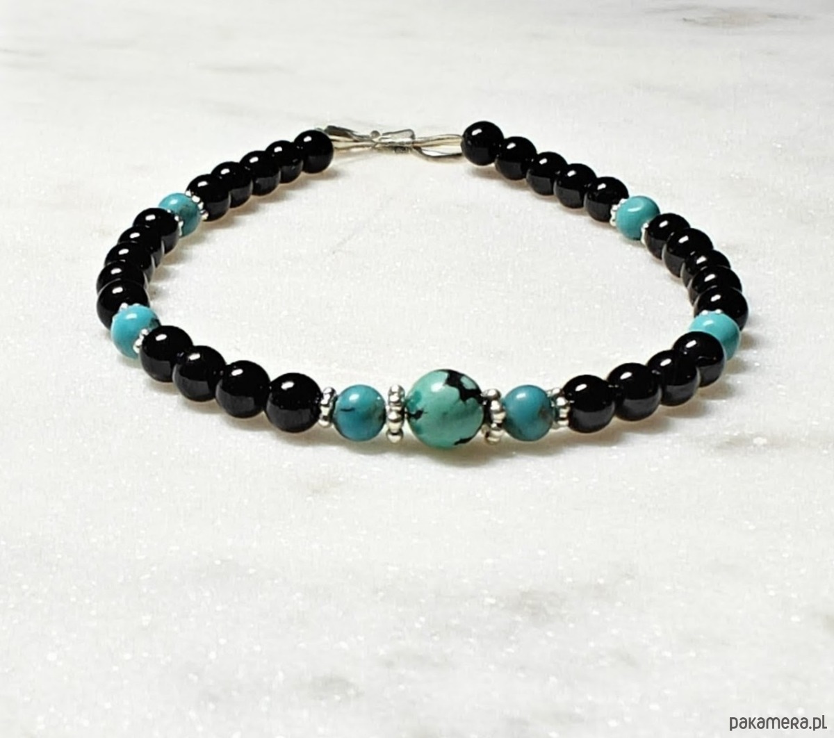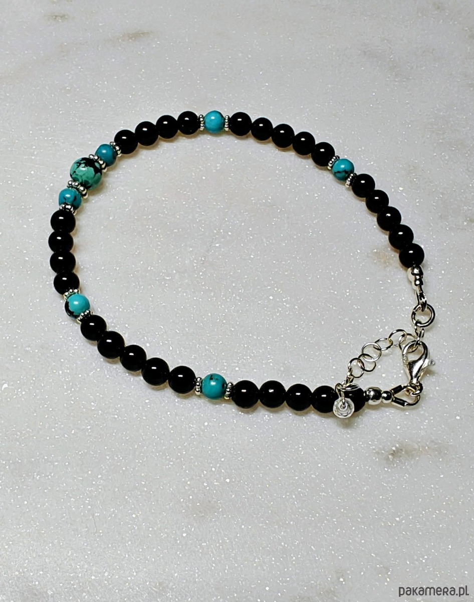 Delikatna, elegancja bransoletka. Wykonana z gładkich kul turmalinu, z dodatkiem pięknego turkusu. Turkus wysokiej jakości, w intensywnym, nasyconym kolorze, z delikatnymi żyłkami.