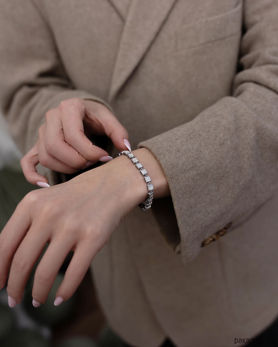 Chcesz poczuć się jak milion dolarów nawet w dżinsach i białej koszuli? Jej perfekcyjnie oszlifowane, kwadratowe cyrkonie układają się w lśniącą linię, która mieni się przy każdym ruchu nadgarstka. Efekt? Magiczne refleksy światła i... zachwyt w oczach innych.To biżuteria dla kobiet, które kochają błysk, ale zawsze z klasą. Subtelna elegancja, której nie da się nie zauważyć. Bransoletka pięknie prezentuje się solo, ale możesz też zestawić ją z innymi, uzyskując bardziej nowoczesny look. W każdej sytuacji czuj się piękna, stylowa i pewna siebie.Dlaczego musisz ją mieć?kwadratowe, lśniące cyrkonie elegancki i nowoczesny designświetna na prezent - wygląda luksusowopasuje do każdej stylizacji - od casual po glamourWymiary:Długość: 17,5 cmWielkość oczka: 0,6 cmMateriał: stal nierdzewna + cyrkonie