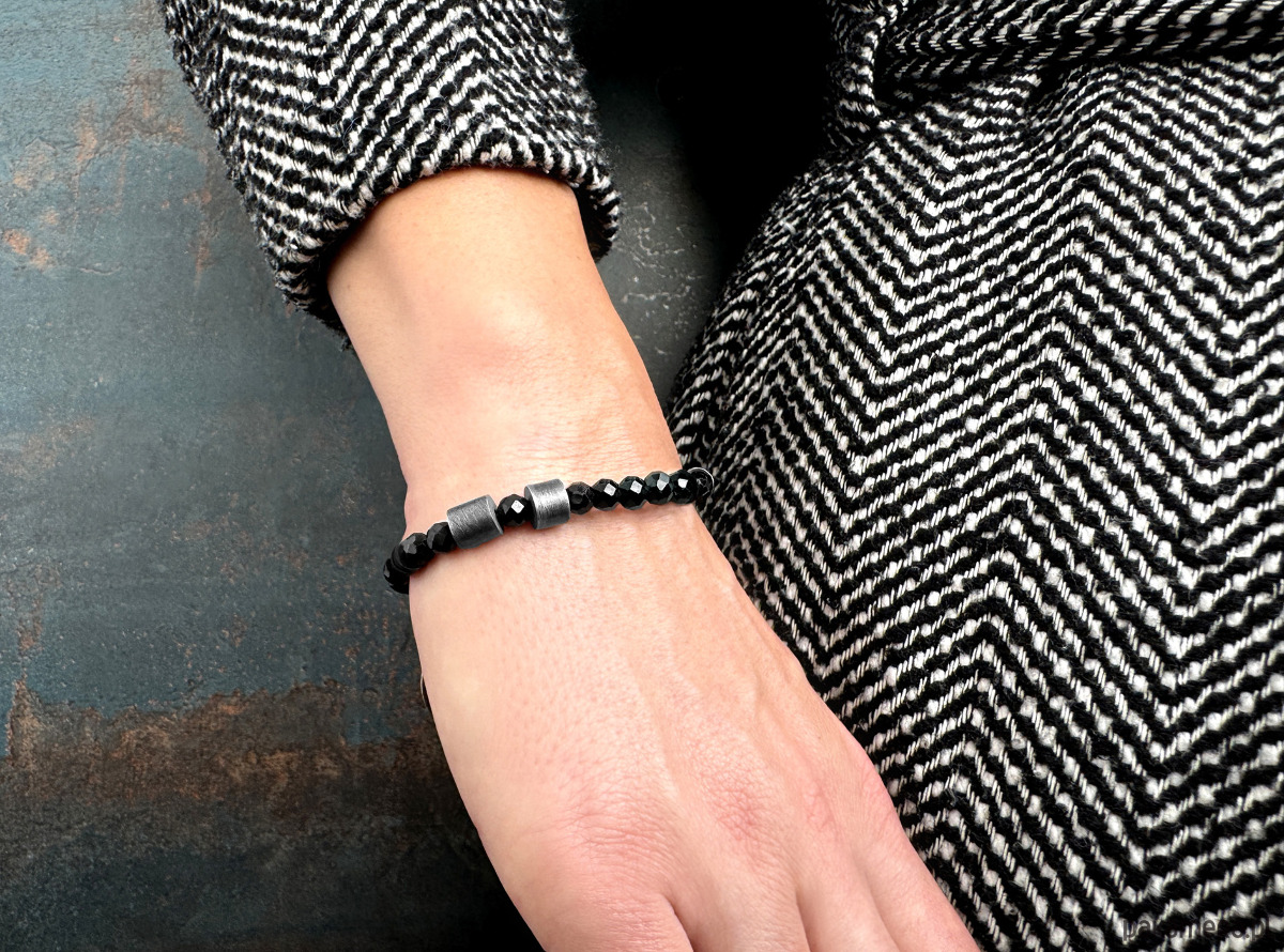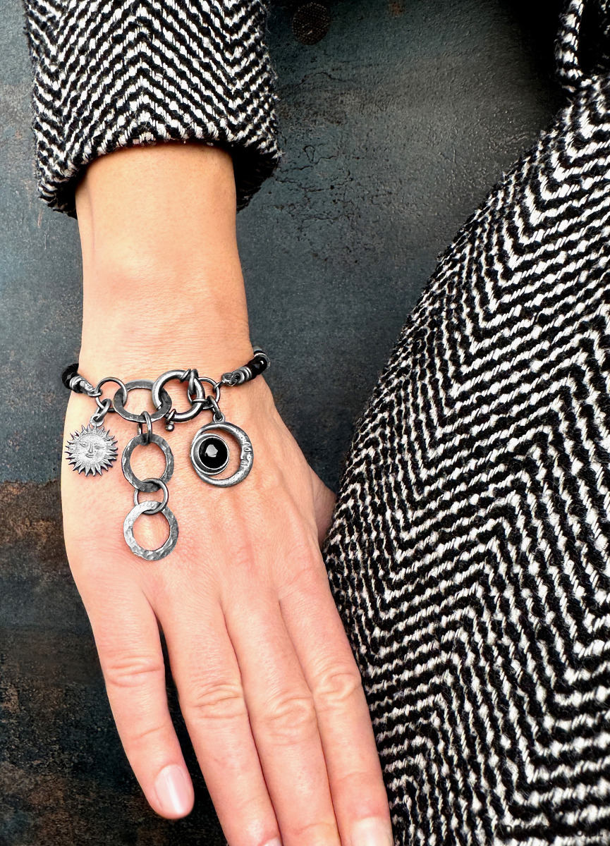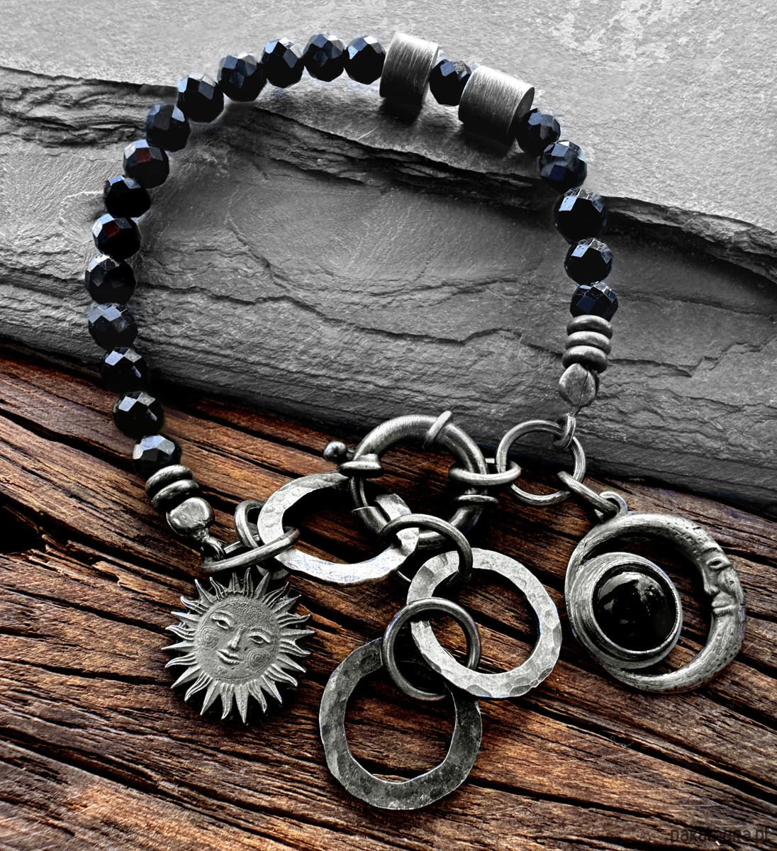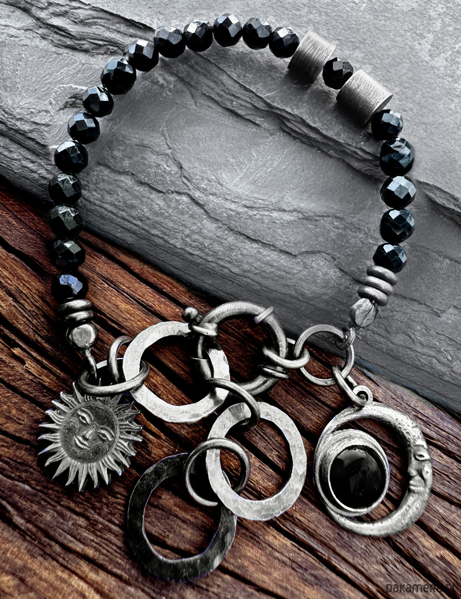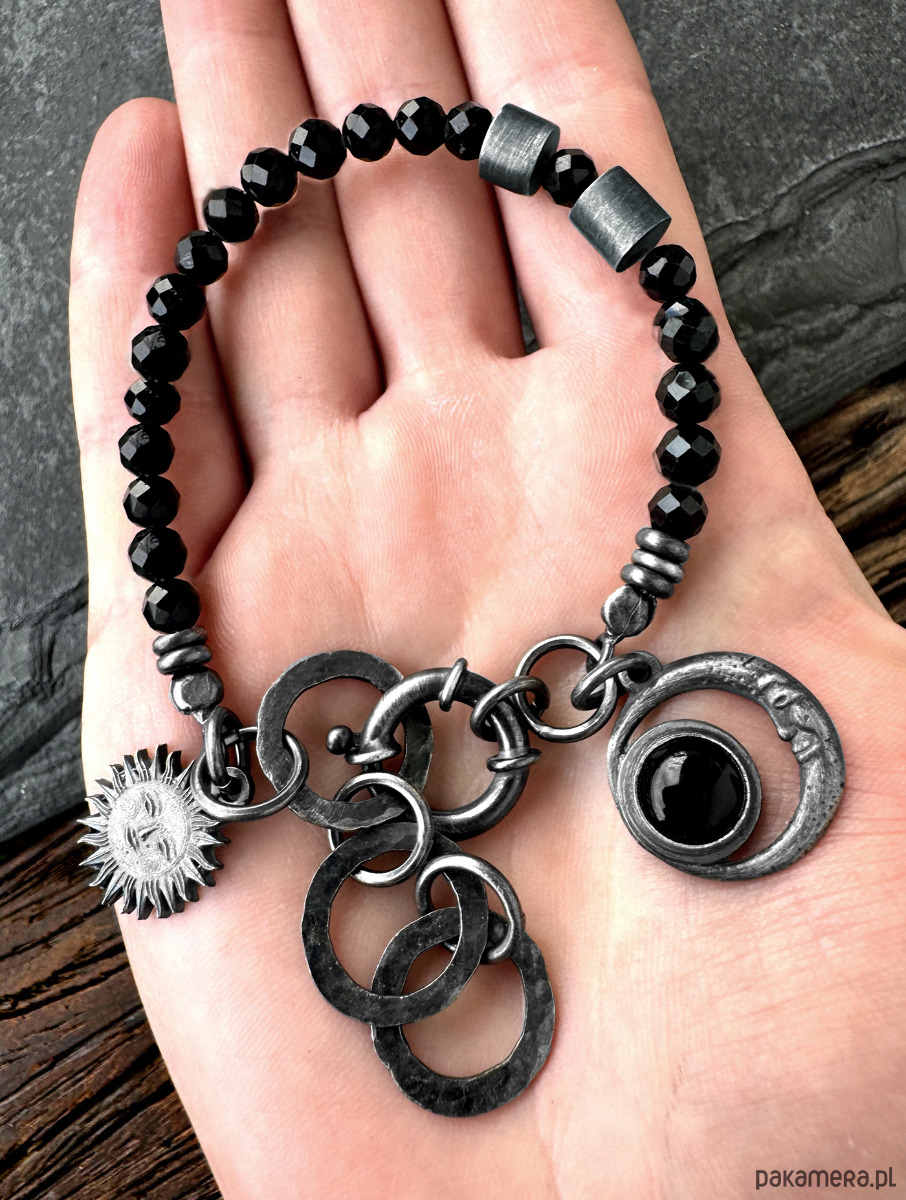 Autorska bransoletka wykonana z oksydowanego srebra najwyższej próby 999 i 925 oraz fasetowanych kulek czarnego turmalinu o średnicy 6 mm. Do bransoletki dołączone są dwie zawieszki charmsy: symbol Słońca oraz Księżyc z oprawionym czarnym onyksem o średnicy 10 mm.