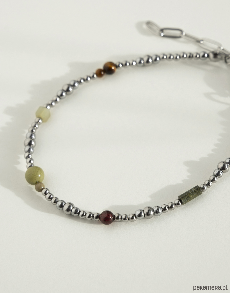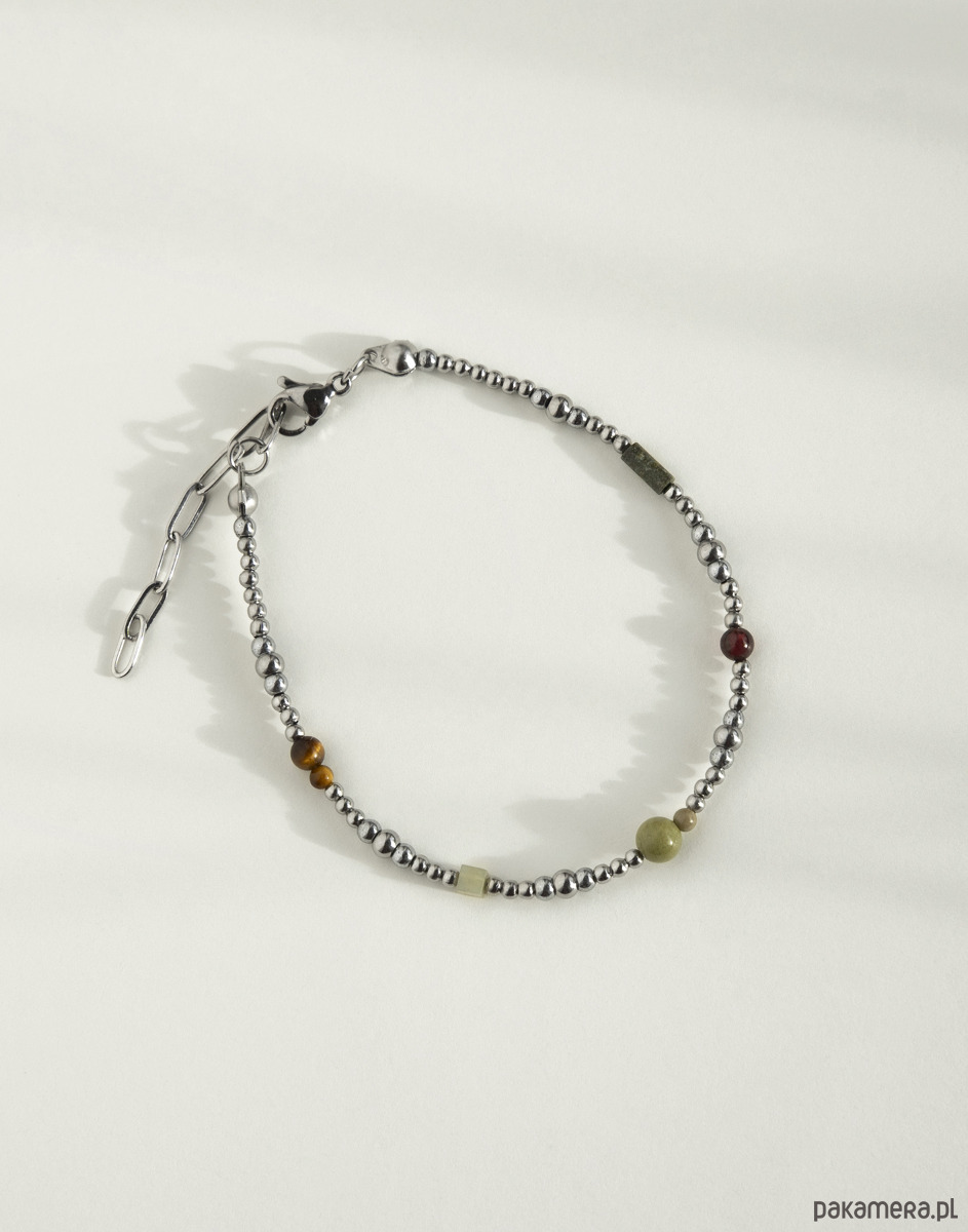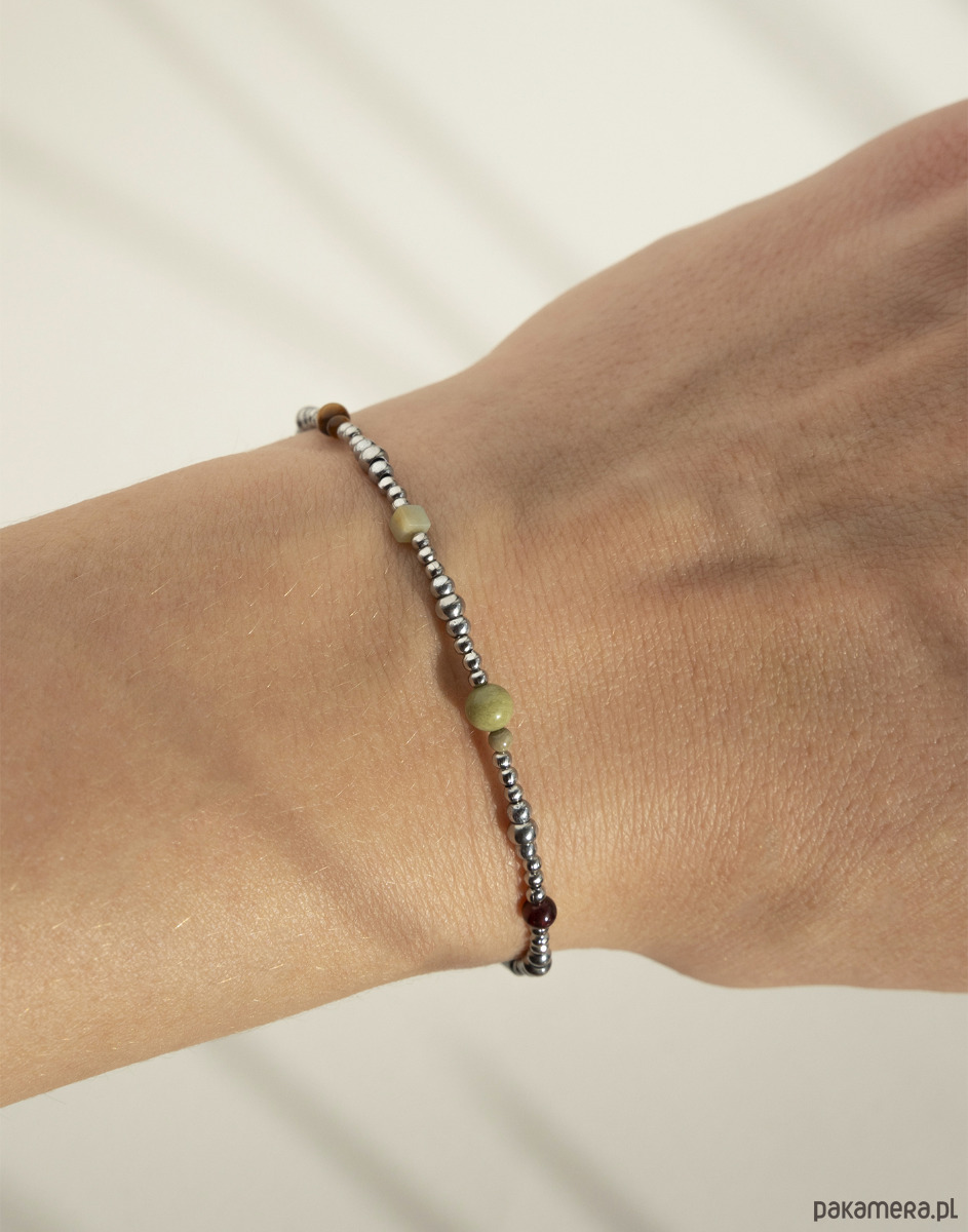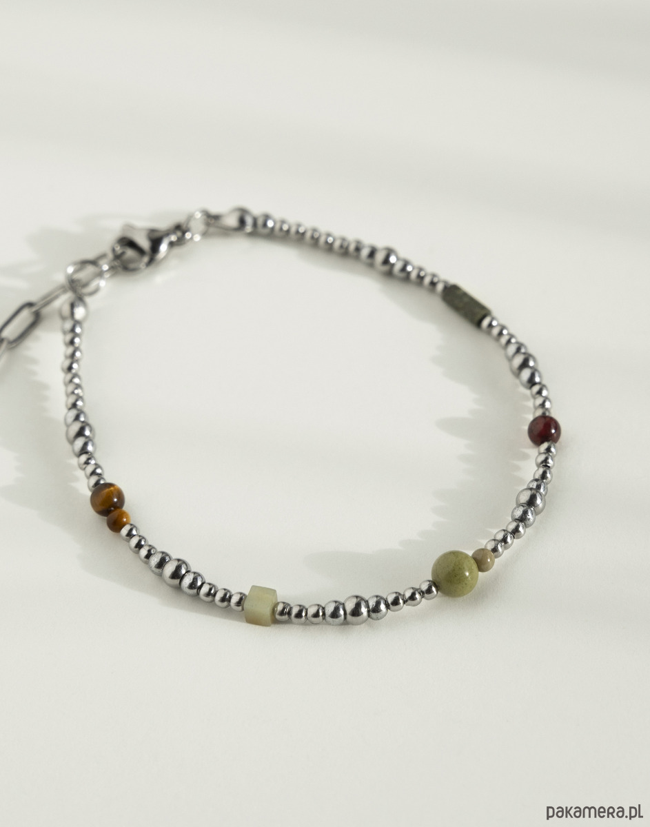 Bransoletkę wykonano ze stali chirurgicznej z możliwością regulacji. Srebrne kuleczki ze stali delikatnie przeplatają się z naturalnymi kamieniami o różnych wielkościach: jaspisem smoczym, granatem, tygrysim okiem, amazonitem, jadeitem oraz hematytem.