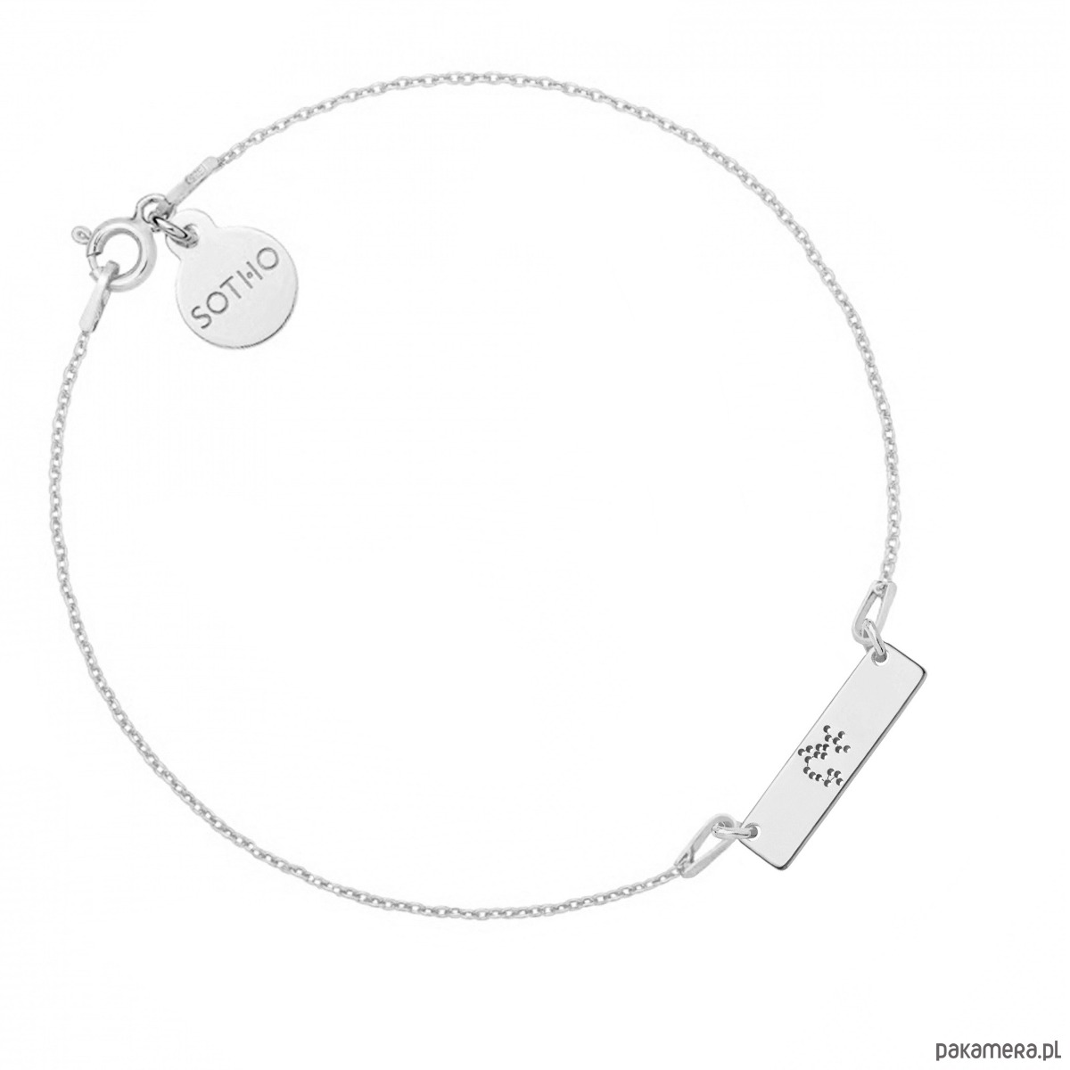 Srebrna bransoletka łańcuszkowa zdobiona konstelacją zodiakalną Strzelca i zawieszką z logo marki. Całość wykonana ze srebra 925.
