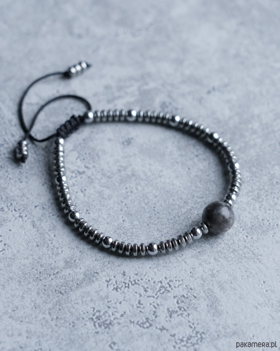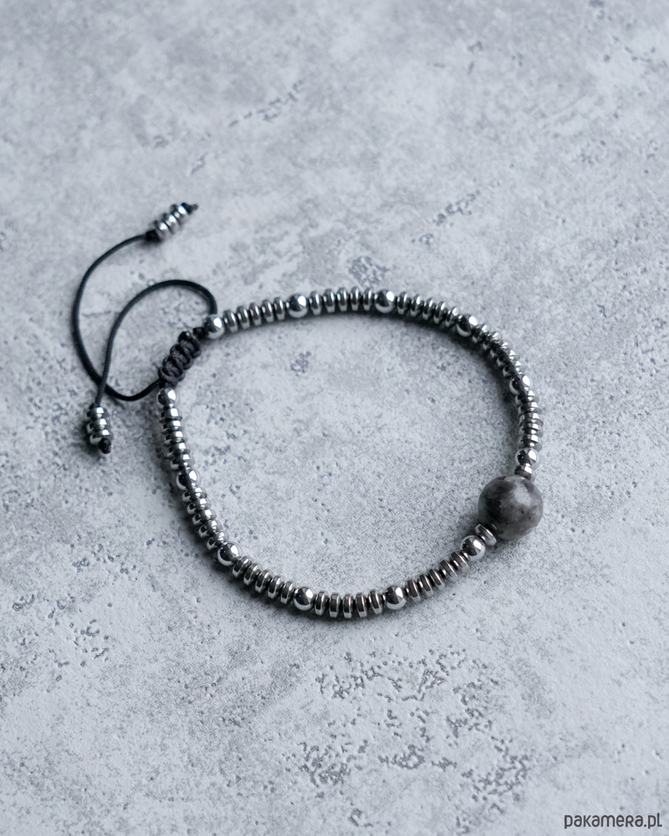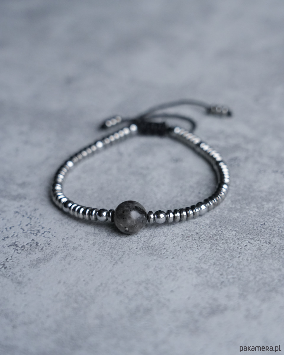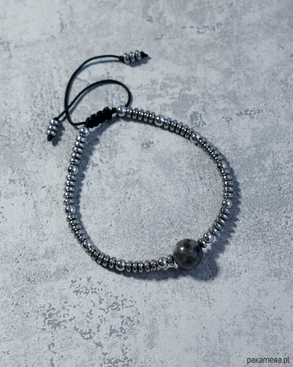Ozdobna bransoletka wykonana ze srebrnego HEMATYTU z kulką z szarego LARVIKITU. Kamienie są nawleczone na mocny sznureczek w kolorze czarnym.