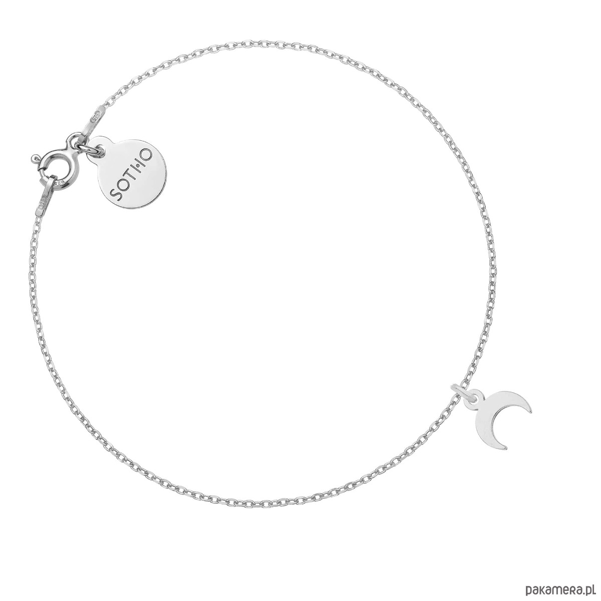 Srebrnna bransoletka łańcuszkowa zdobiona małym księżycem i zawieszką z logo marki. Całość wykonana ze srebra 925.