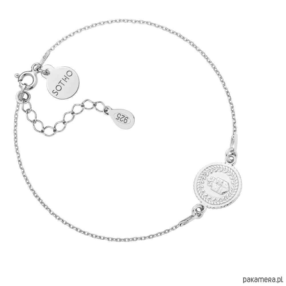 Srebrna bransoletka łańcuszkowa zdobiona medalionem i zawieszką z logo marki. Całość wykonana ze srebra 925.