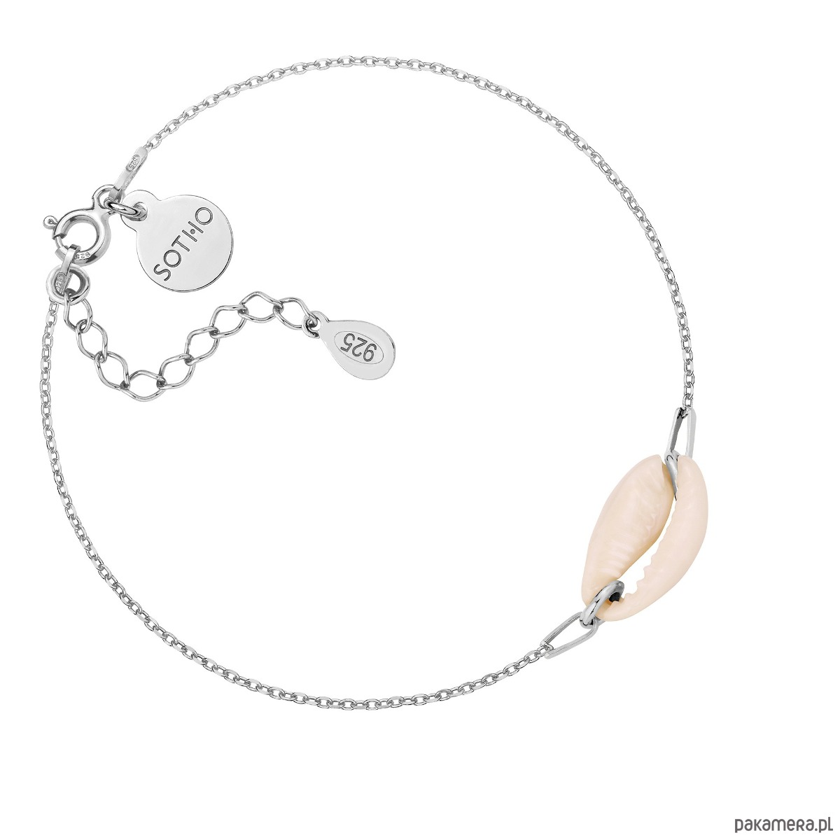 Srebrna bransoletka łańcuszkowa z muszelką i zawieszką z logo marki. Każdy egzemplarz posiada unikatową, niepowtarzalną muszelkę. Całość wykonana ze srebra 925.