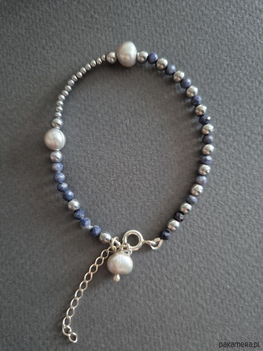 Srebrna bransoletka z niebieskich szafirów i szarych pereł