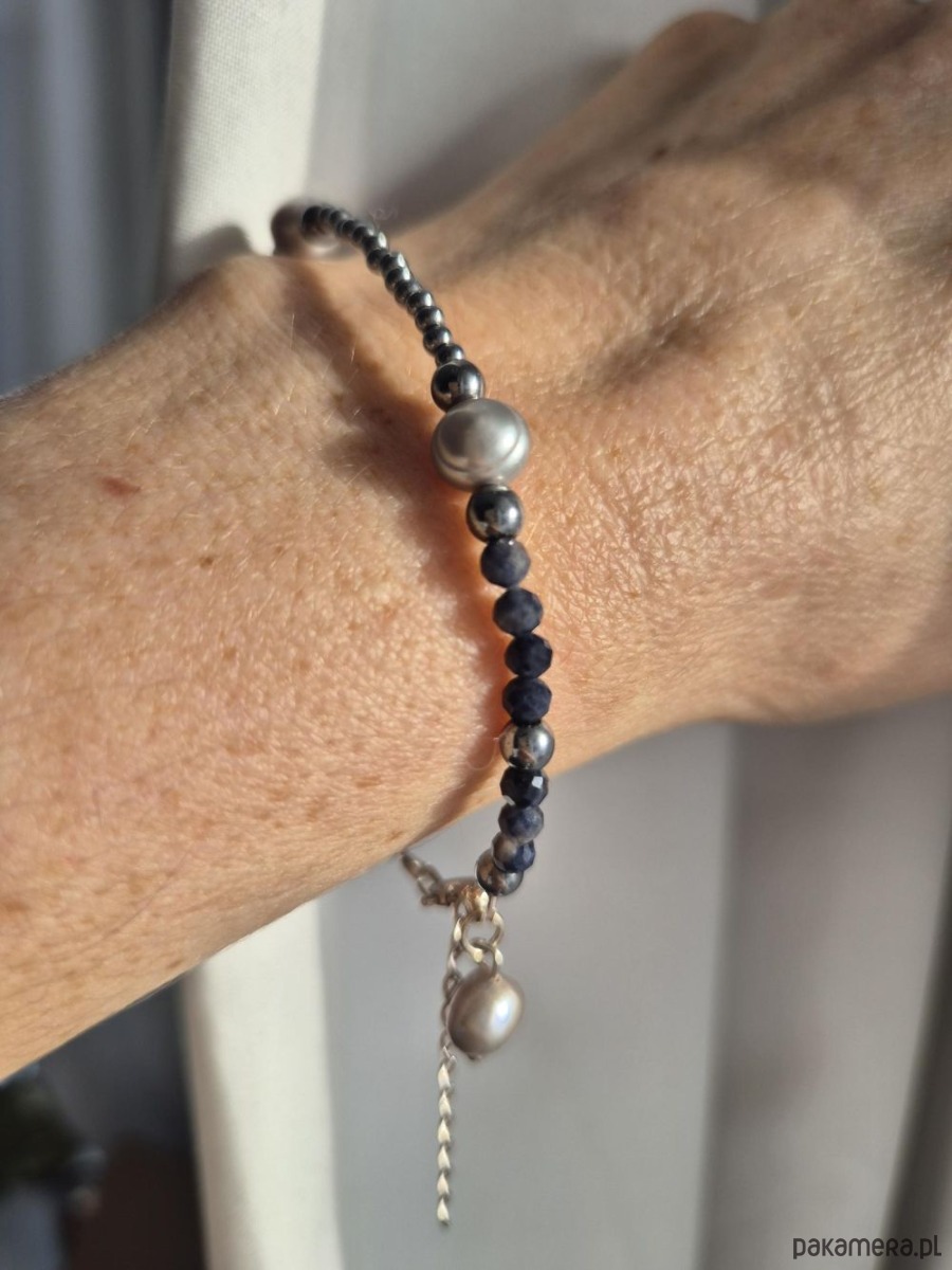 Bransoletka wykonana ręcznie z królewskich kamieni - niebieskich szafirów i szarych, naturalnych pereł i pozłacanych hematytów. Abstrakcyjny projekt bransoletki dopełnia zawieszka z szarej perły i łańcuszek. Bransoletka bije niezwykłym blaskiem, a jej walory można docenić na żywo. Elegancki dodatek do wielu stylizacji, białych koszul, granatowych jeansów, szarych marynarek, różowych bluz.