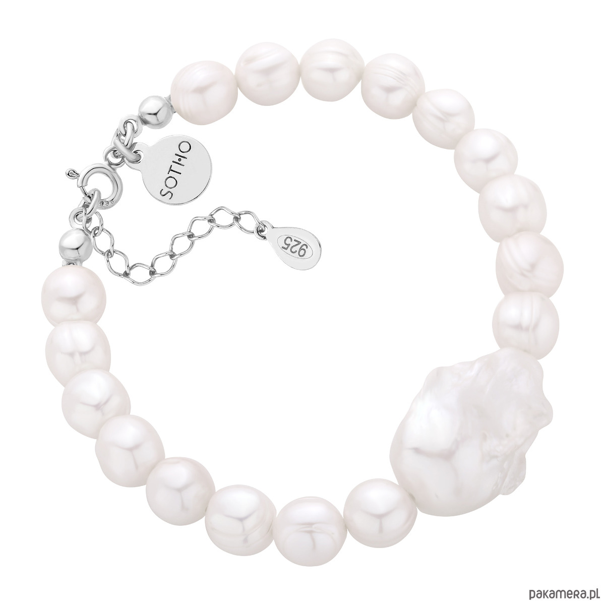 Srebrna bransoletka wykonana z naturalnych pereł słodkowodnych z barokową perłą oraz zawieszką z logo marki. Wszystkie elementy wykonane ze srebra 925.