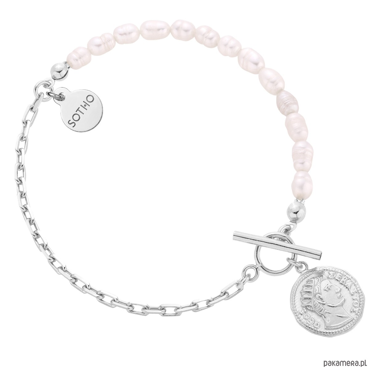 Srebrna bransoletka z naturalnych pereł zdobiona monetą, łańcuchem i zawieszką z logo marki. Całość wykonana ze srebra 925.