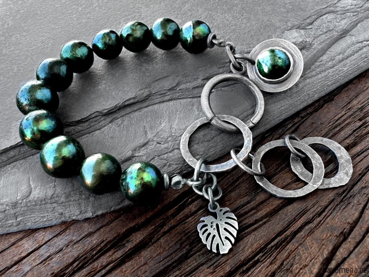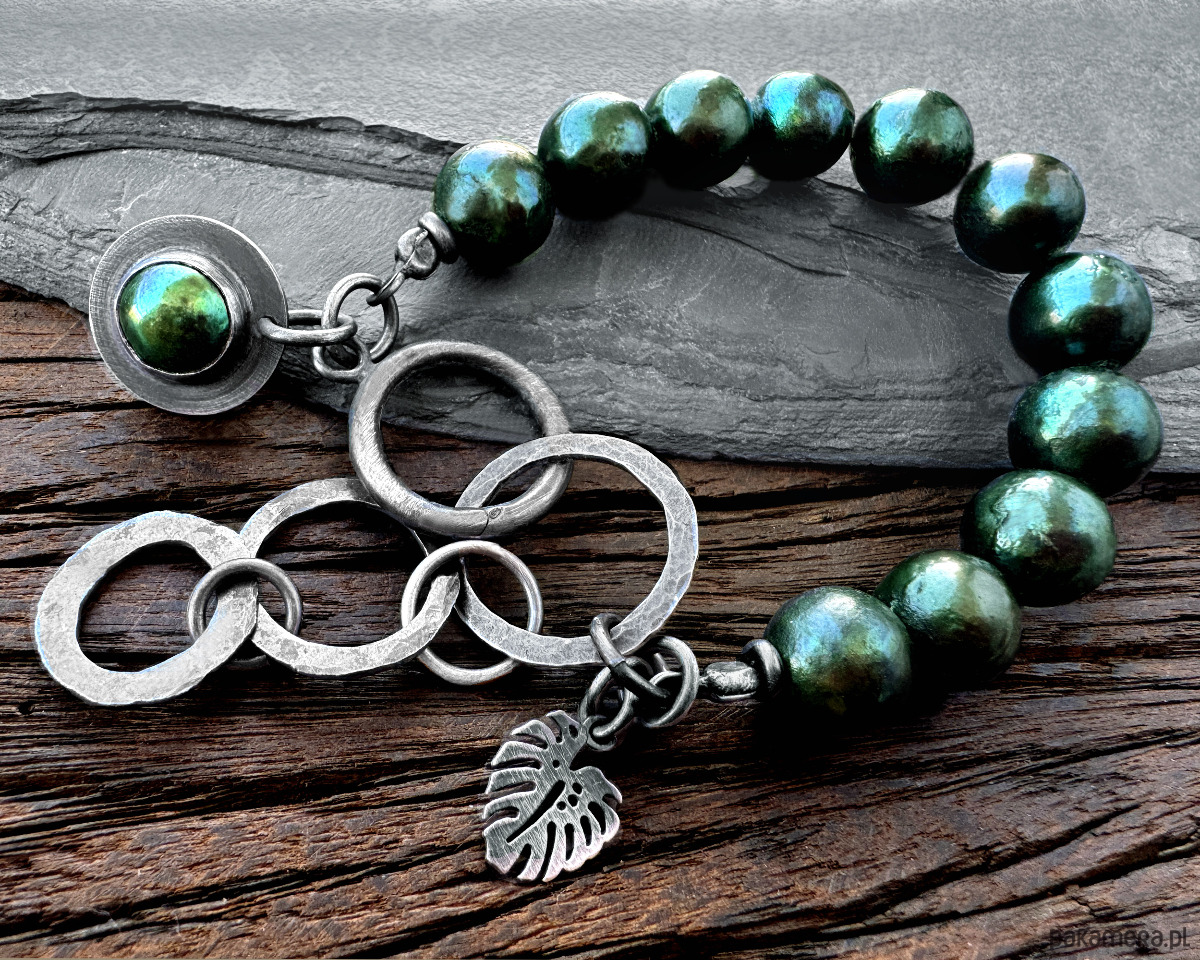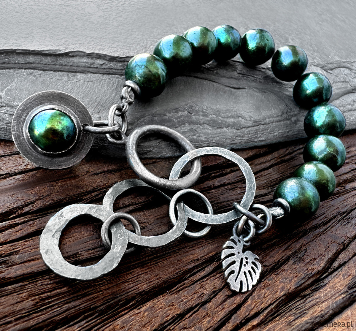 Srebrna bransoletka wykonana z ręcznie profilowanego oksydowanego srebra najwyższej próby 999 i 925 oraz naturalnych, okrągłych, pereł słodkowodnych w pięknym kolorze intensywnej zieleni butelkowej. Perły w słońcu lub pełnym oświetleniu mienią się fantastycznym, złotym poblaskiem.