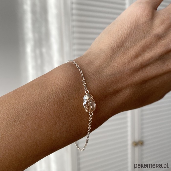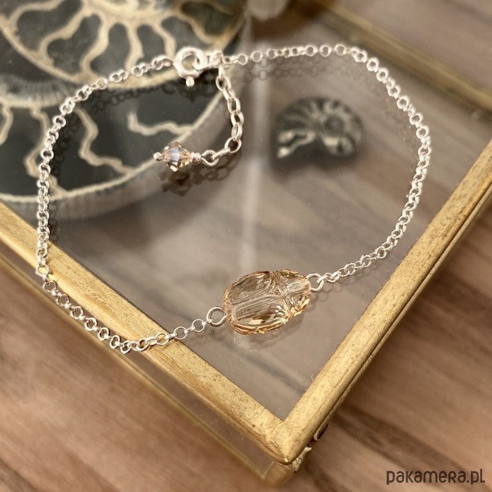 Wykonałam ją na bazie cienkiego srebrnego łańcuszka (próba 925) o okrągłych ogniwkach, w jego środek wplatając oryginalny kryształek Swarovski - skarabeusza w odcieniu Golden Shadow (odcień złota).