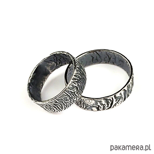 Oryginalne obrączki wykonane ze srebra próby 925. Ciekawa faktura, srebro pokryte oksydą. Możliwe zamówienie każdego rozmiaru, również wykonanie w jasnym srebrze oraz złocie. Waga jednej obrączki 3-3.8 g. Surowe, awangardowe, z charakterem. Obrączki zostaną spakowane w ozdobne pudełeczko.