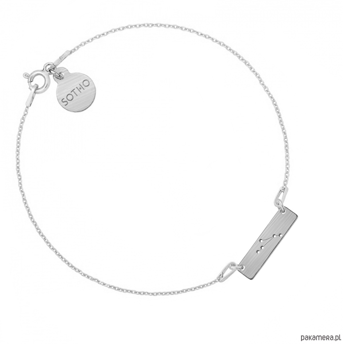 Srebrna matowa bransoletka łańcuszkowa zdobiona konstelacją zodiakalną Barana i zawieszką z logo marki. Całość wykonana ze srebra 925.