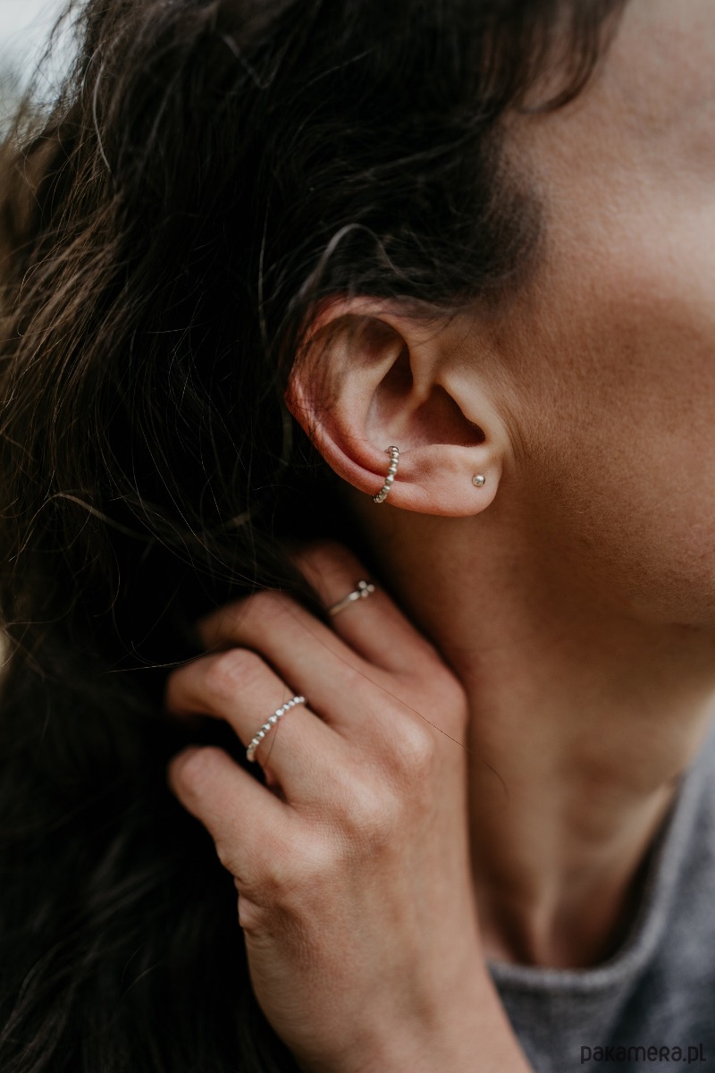 Drobinka to subtelna nausznica stworzona z myślą o osobach, które nie mają przebitych uszu lub lubią bawić się biżuterią w nieoczywisty sposób. Możesz nosić ją na zewnętrznej krawędzi ucha, wyżej lub z boku — za każdym razem wygląda inaczej i daje dużą swobodę stylizacji. Świetnie łączy się z kolczykami z kolekcji Drobiny, którą tworzę w nurcie eko.