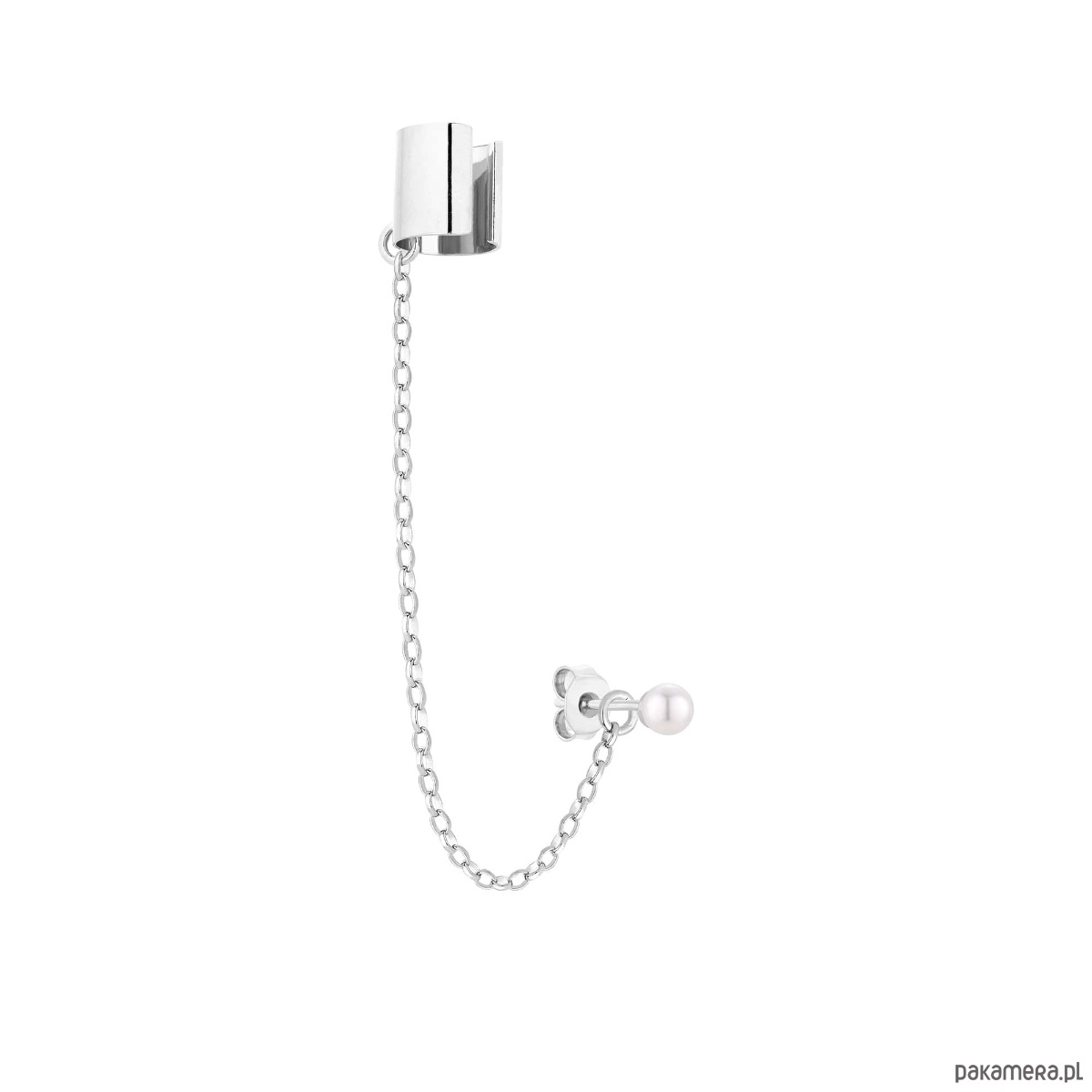 Srebrna gruba nausznica z łańcuszkiem i perłą SWAROVSKI® CRYSTAL w kolorze White, wykonana ze srebra 925.
