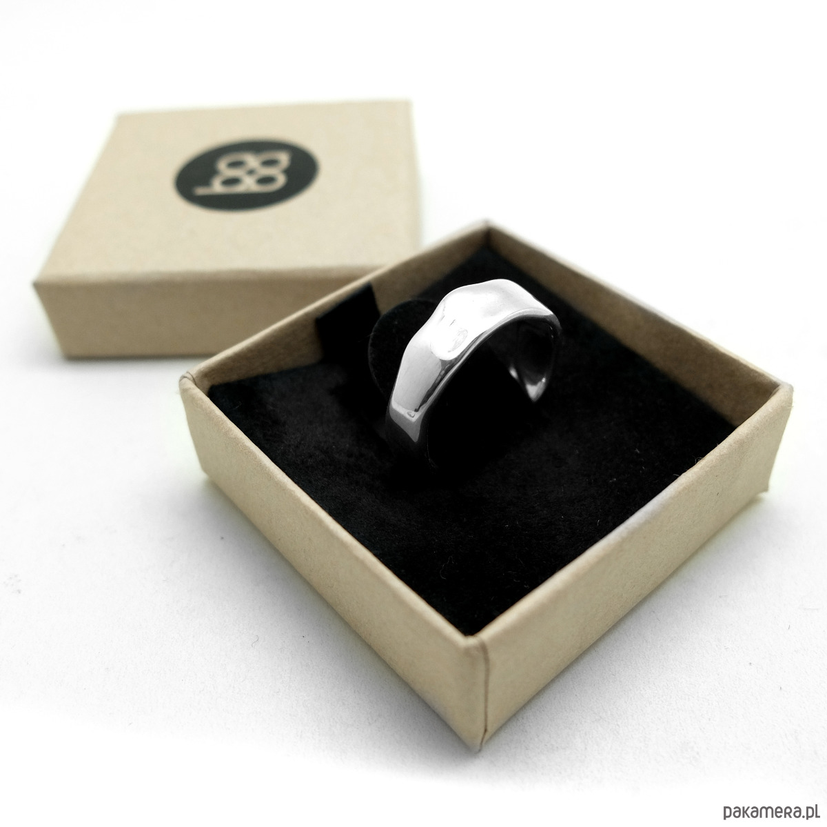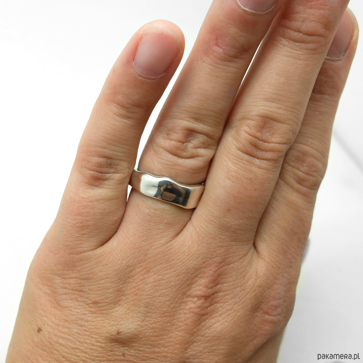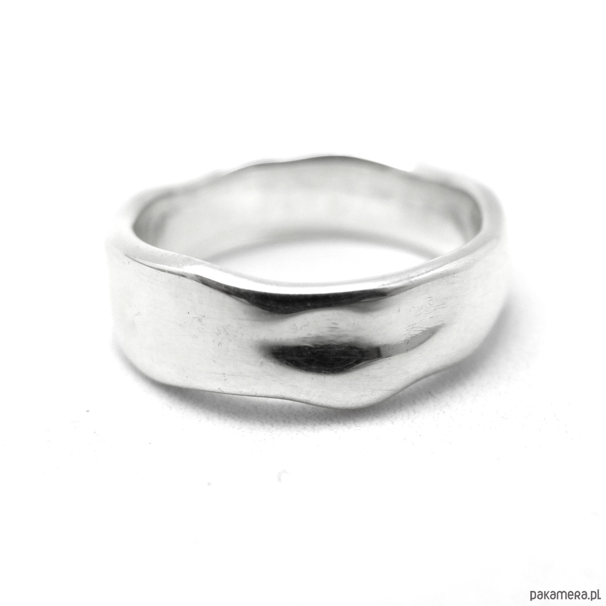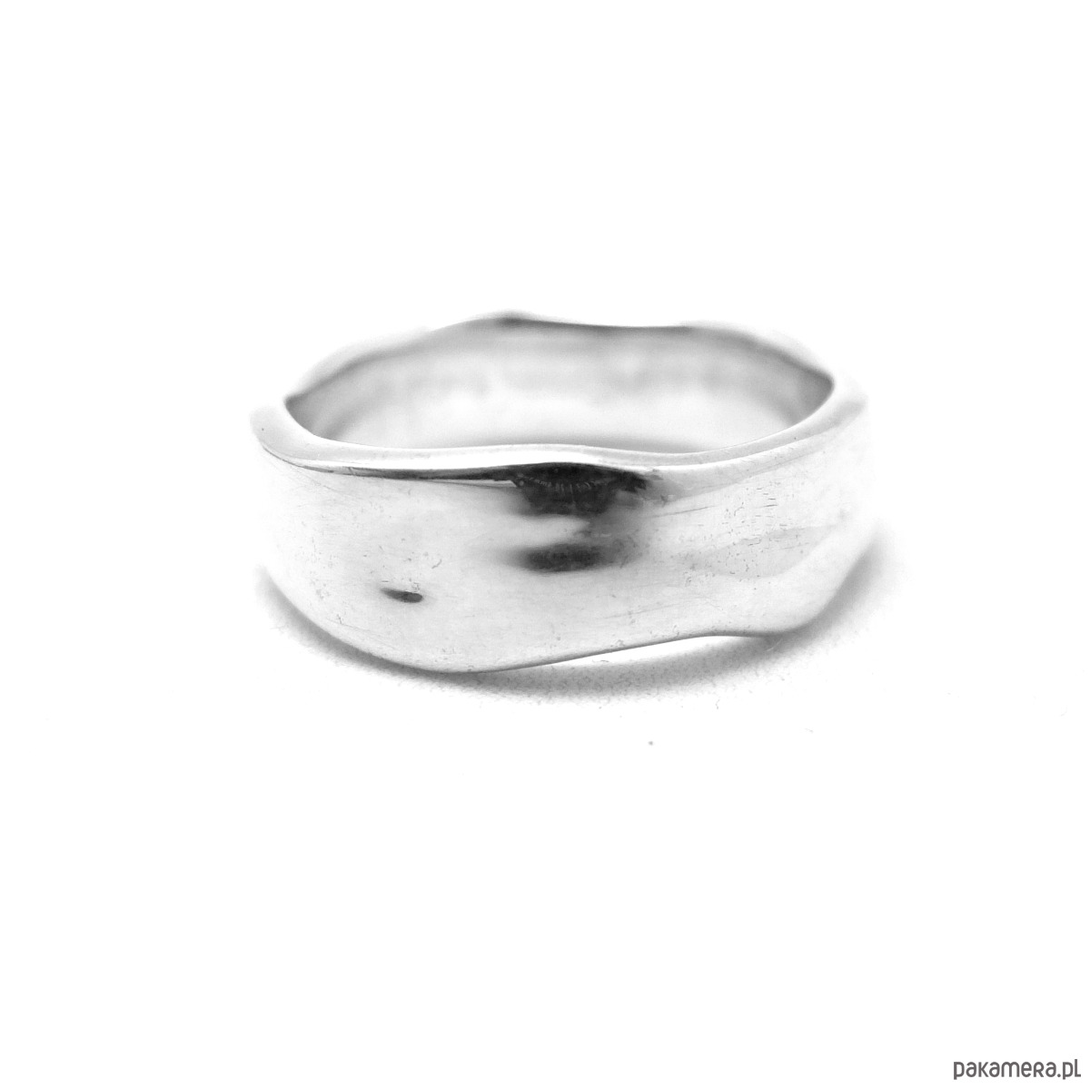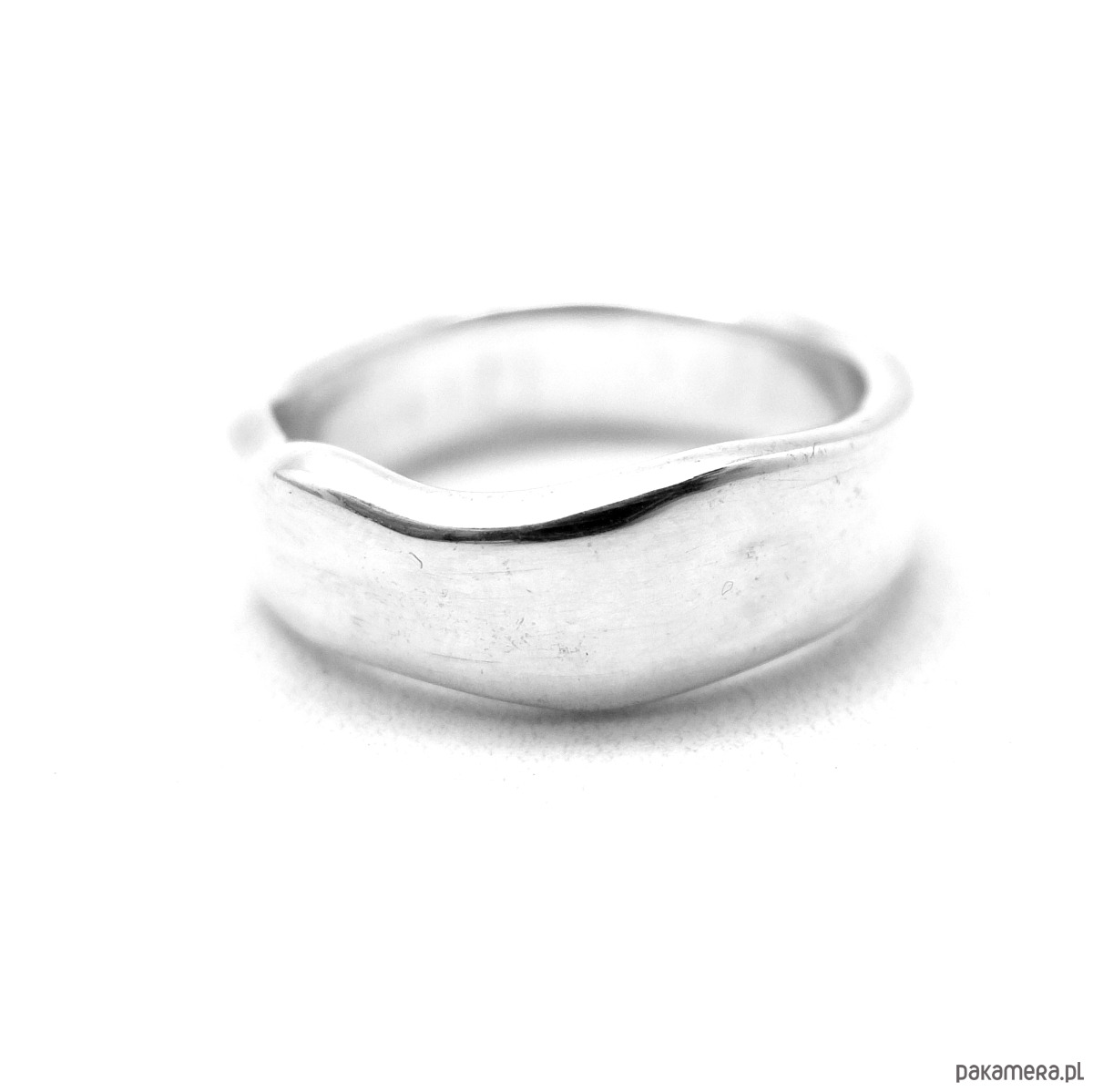 Srebrna obrączka - pierścionek Blurb. Naturalnie uformowane, lejące się kształty sprawiają, że srebrna obrączka z każdej strony prezentuje się inaczej. Nowoczesny pierścionek ma wybitą próbę srebra 0,925.