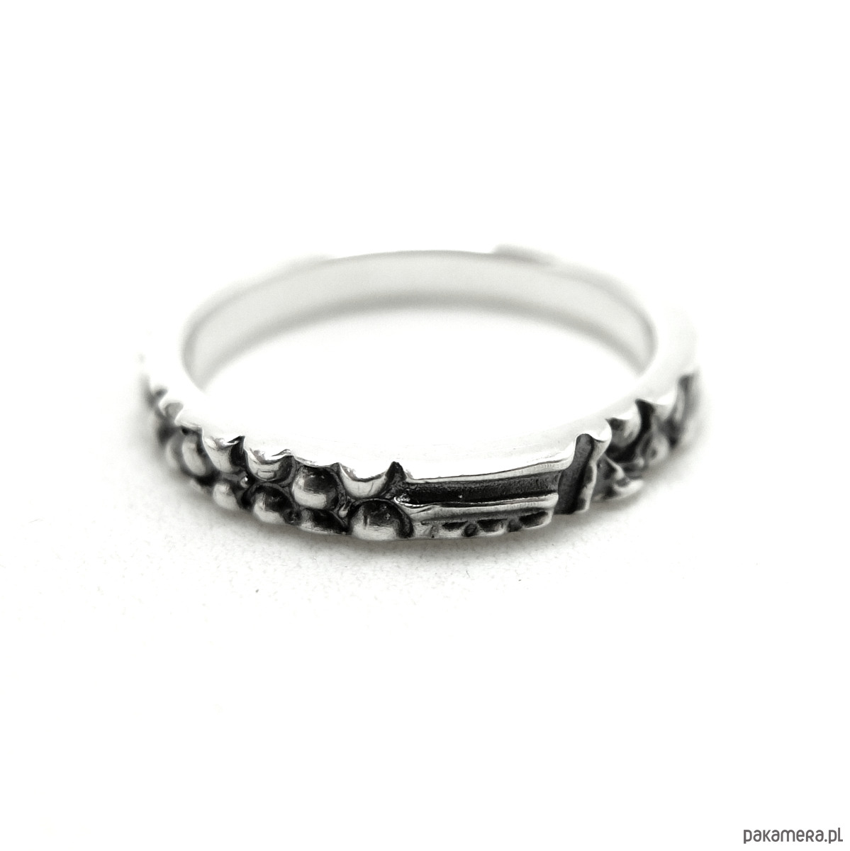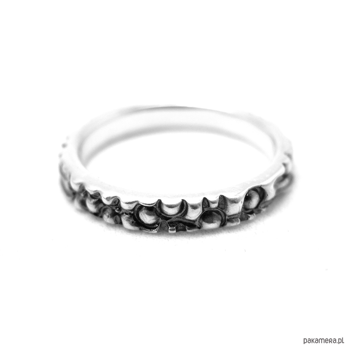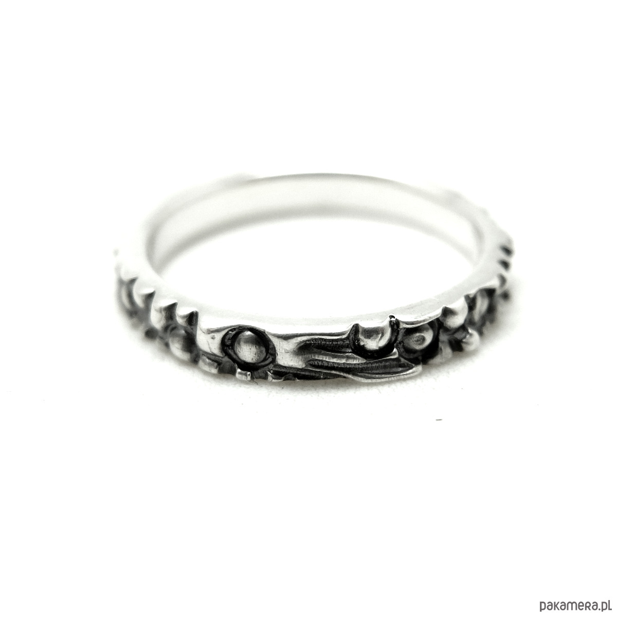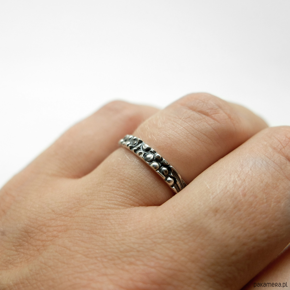 Obrączka o kulkowej strukturze ma wybitą próbę srebra 0,925.