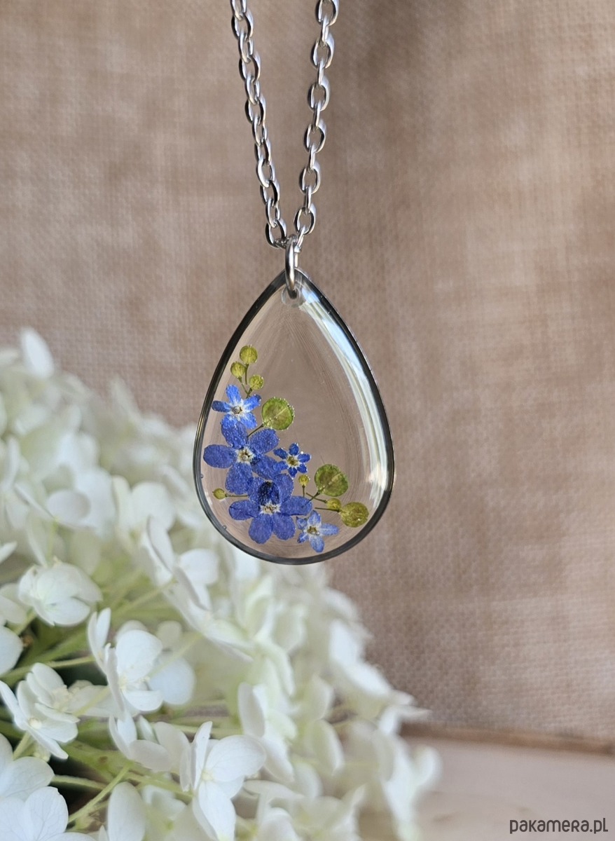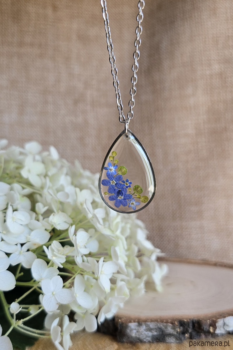 Srebrna wisiorek prawdziwe kwiaty zawieszka łezka łza niezapominajki