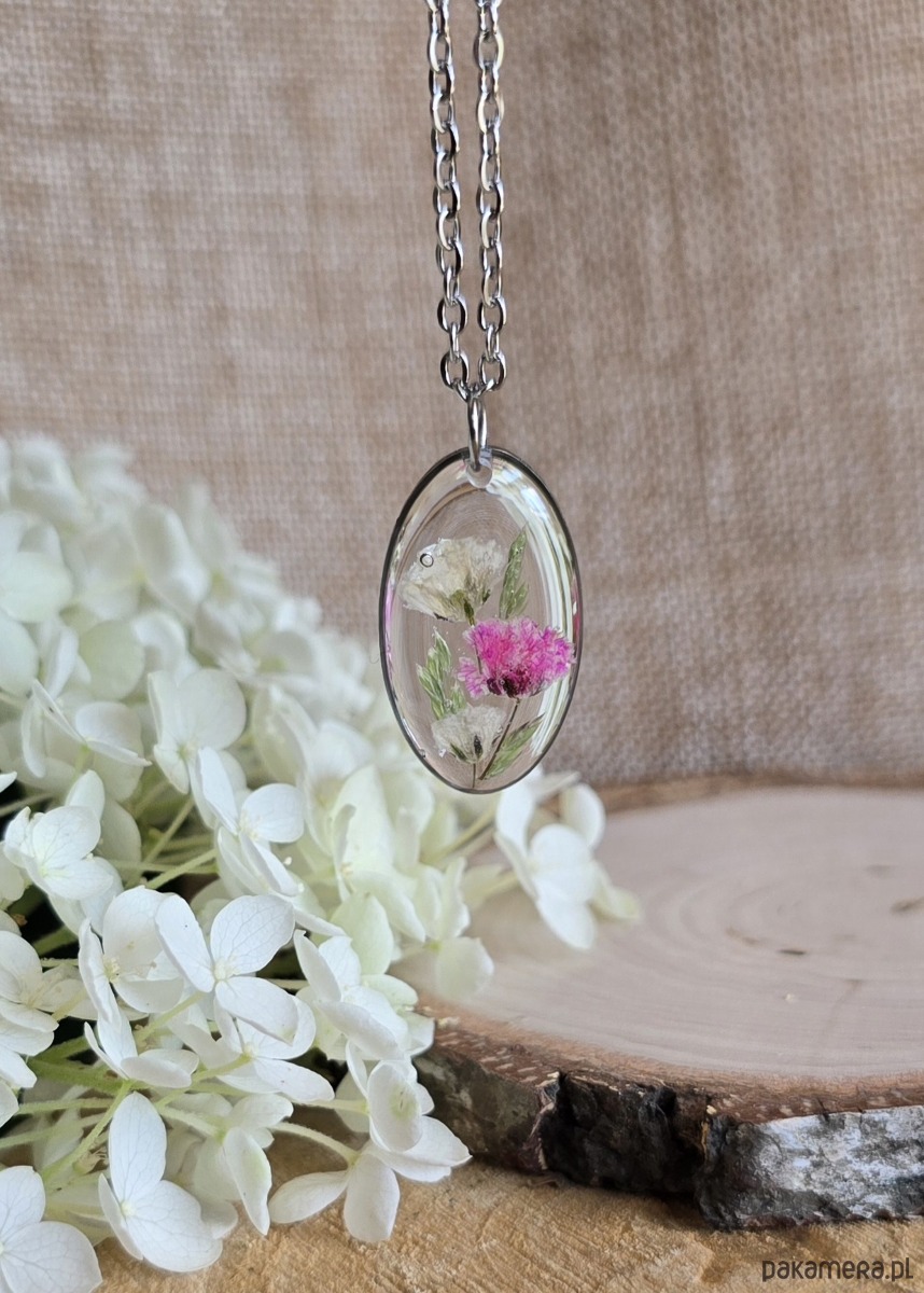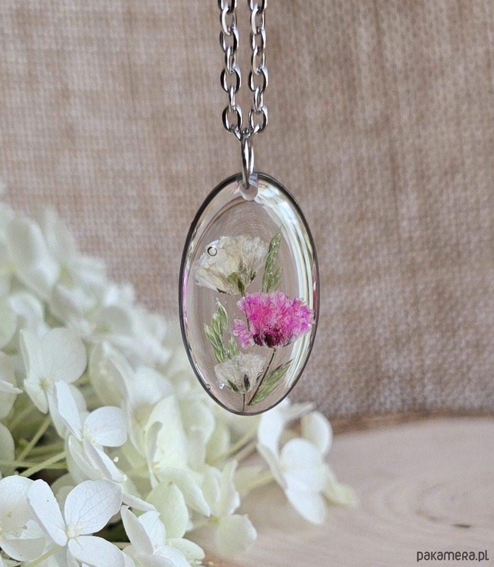 Oferuję Państwu unikalną biżuterię. Zawieszka jest wykonana z suszonych kwiatów i żywicy epoksydowej. Biżuteria jest wspaniałym i oryginalnym prezentem na lata.