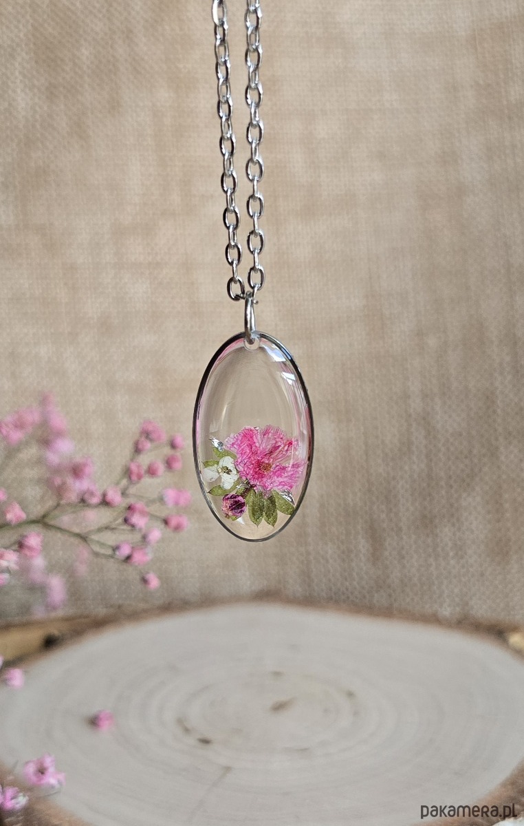 Srebrna zawieszka jajowata suszone kwiatowy bukiet różowa