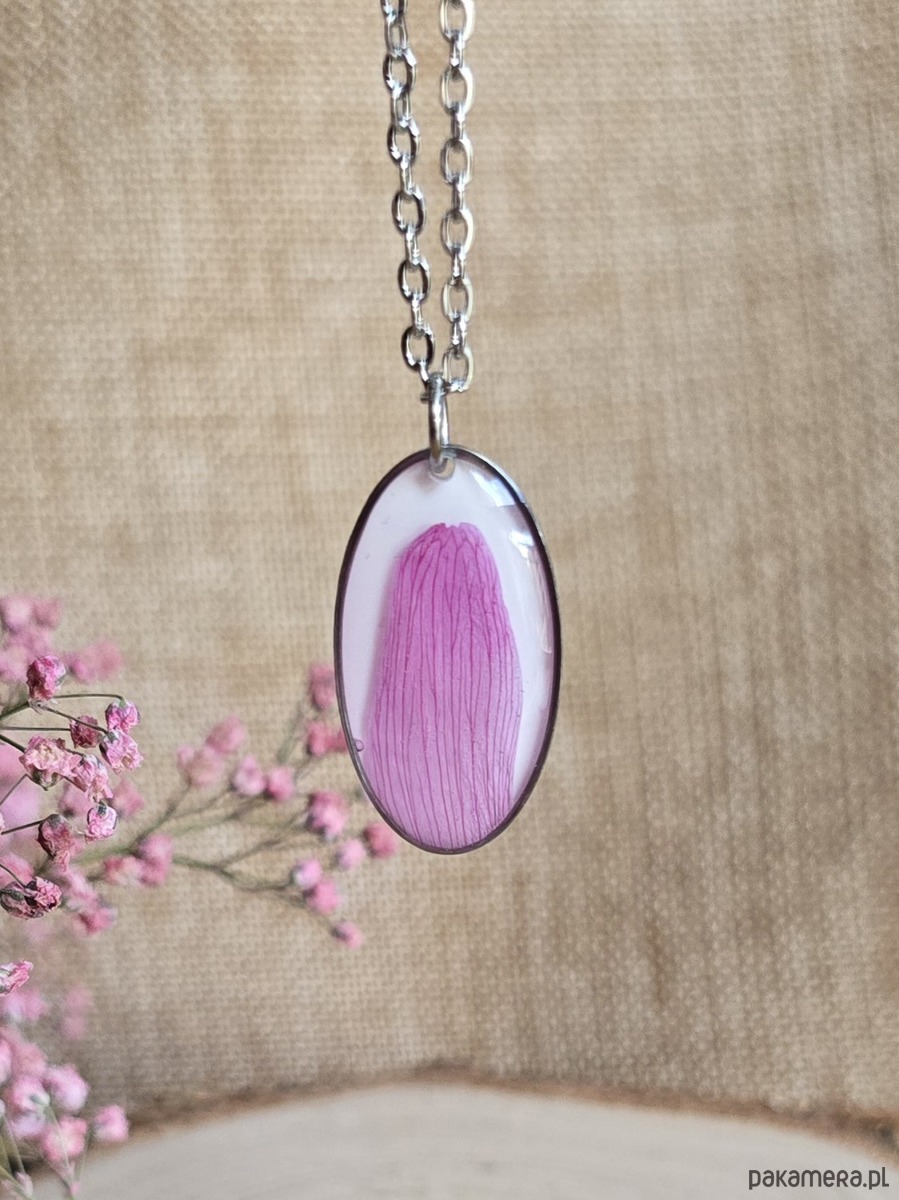 Oferuję Państwu unikalną biżuterię. Zawieszka jest wykonana z suszonych kwiatów i żywicy epoksydowej. Biżuteria jest wspaniałym i oryginalnym prezentem na lata.