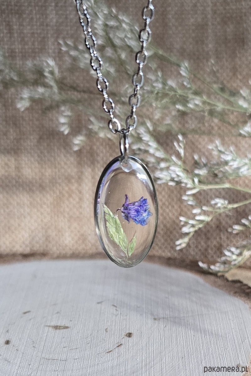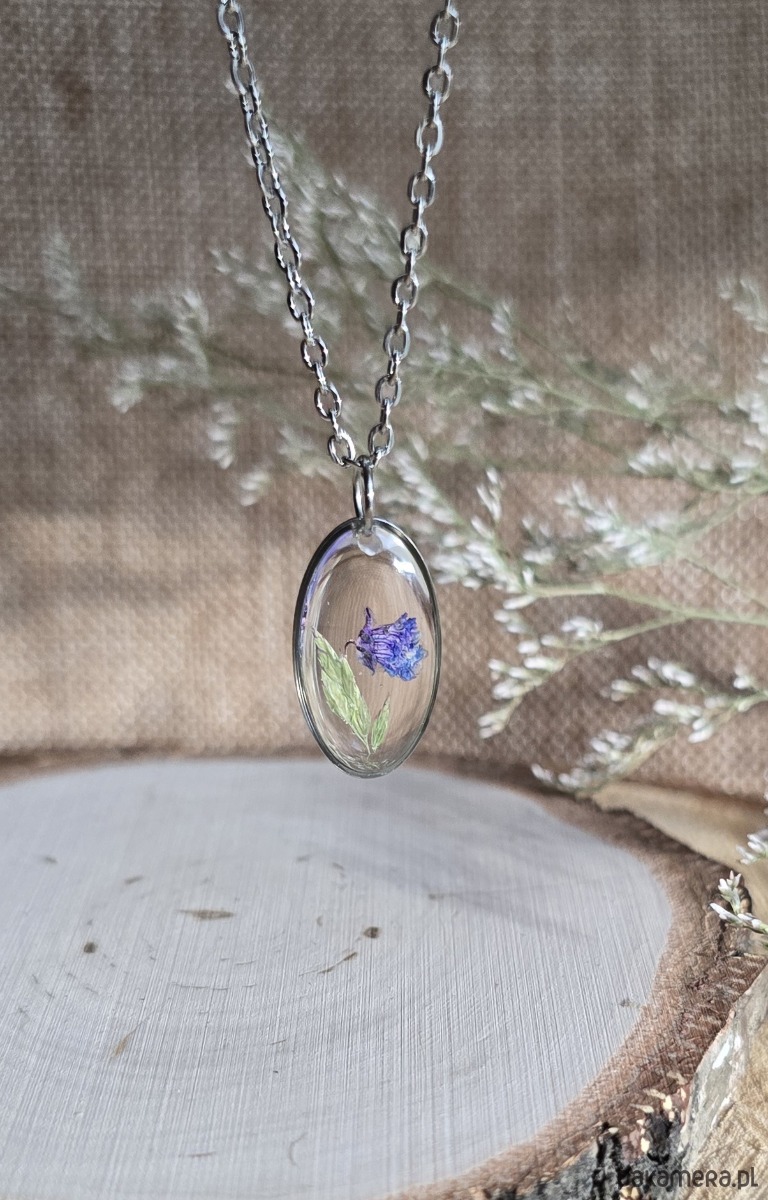 Oferuję Państwu unikalną biżuterię. Zawieszka jest wykonana z suszonych kwiatów i żywicy epoksydowej. Biżuteria jest wspaniałym i oryginalnym prezentem na lata.