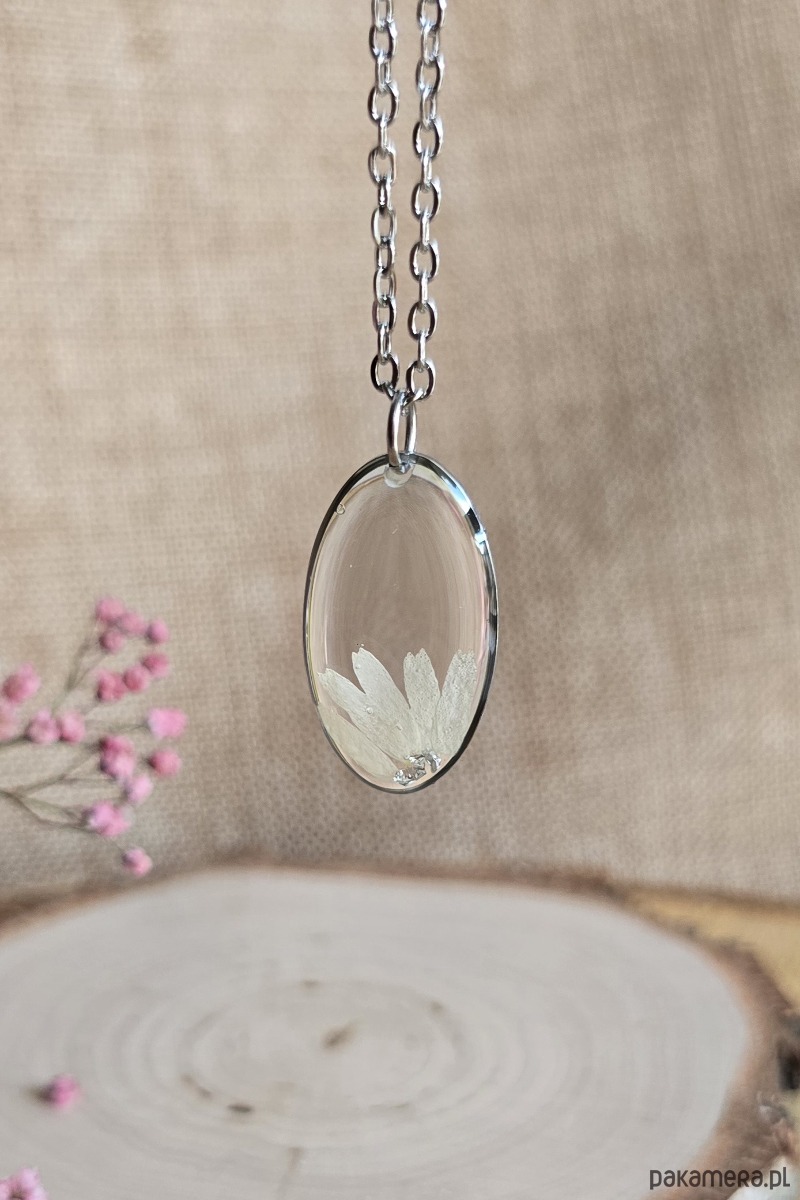 Srebrna zawieszka jajowata suszone kwiaty stokrotka ze stokrotką