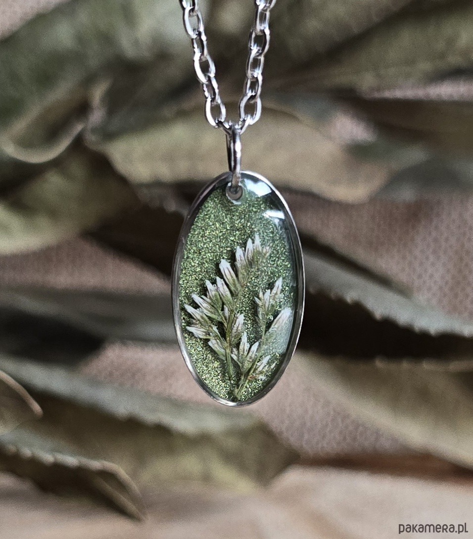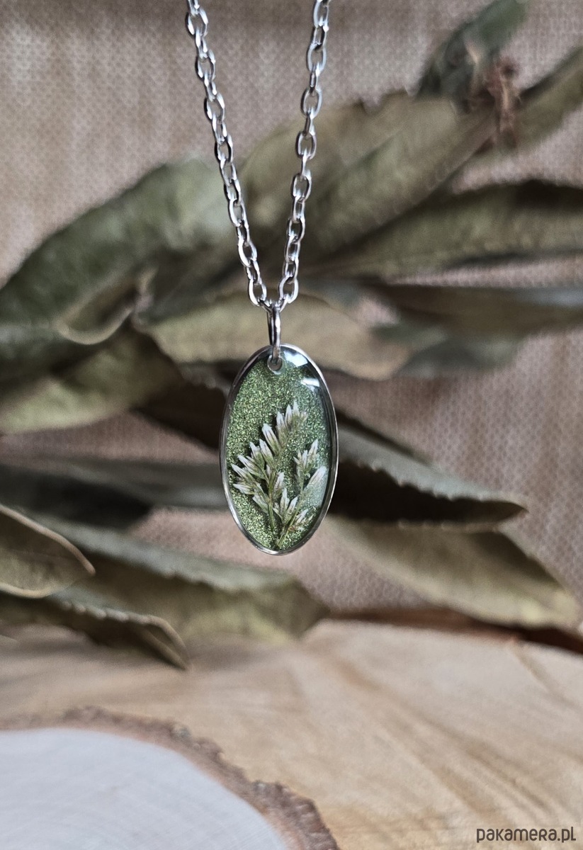 Srebrna zawieszka jajowata suszone kwiaty zboża zielona