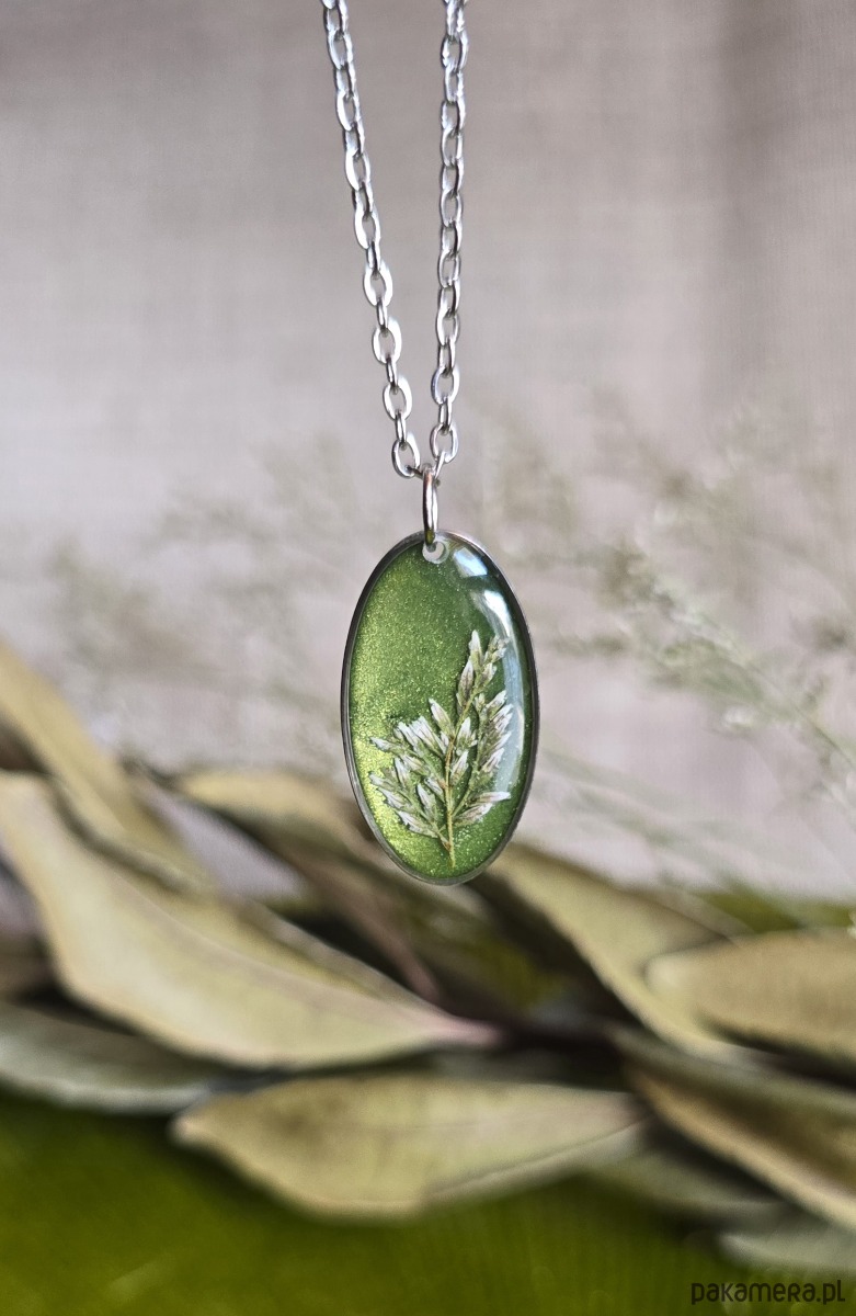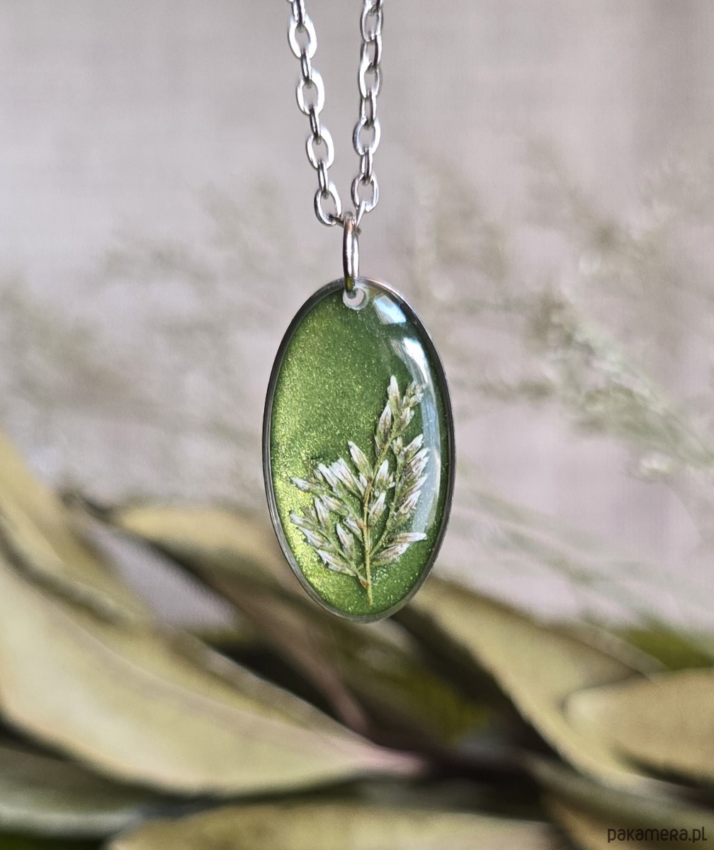 Srebrna zawieszka jajowata suszone kwiaty zboża zielona